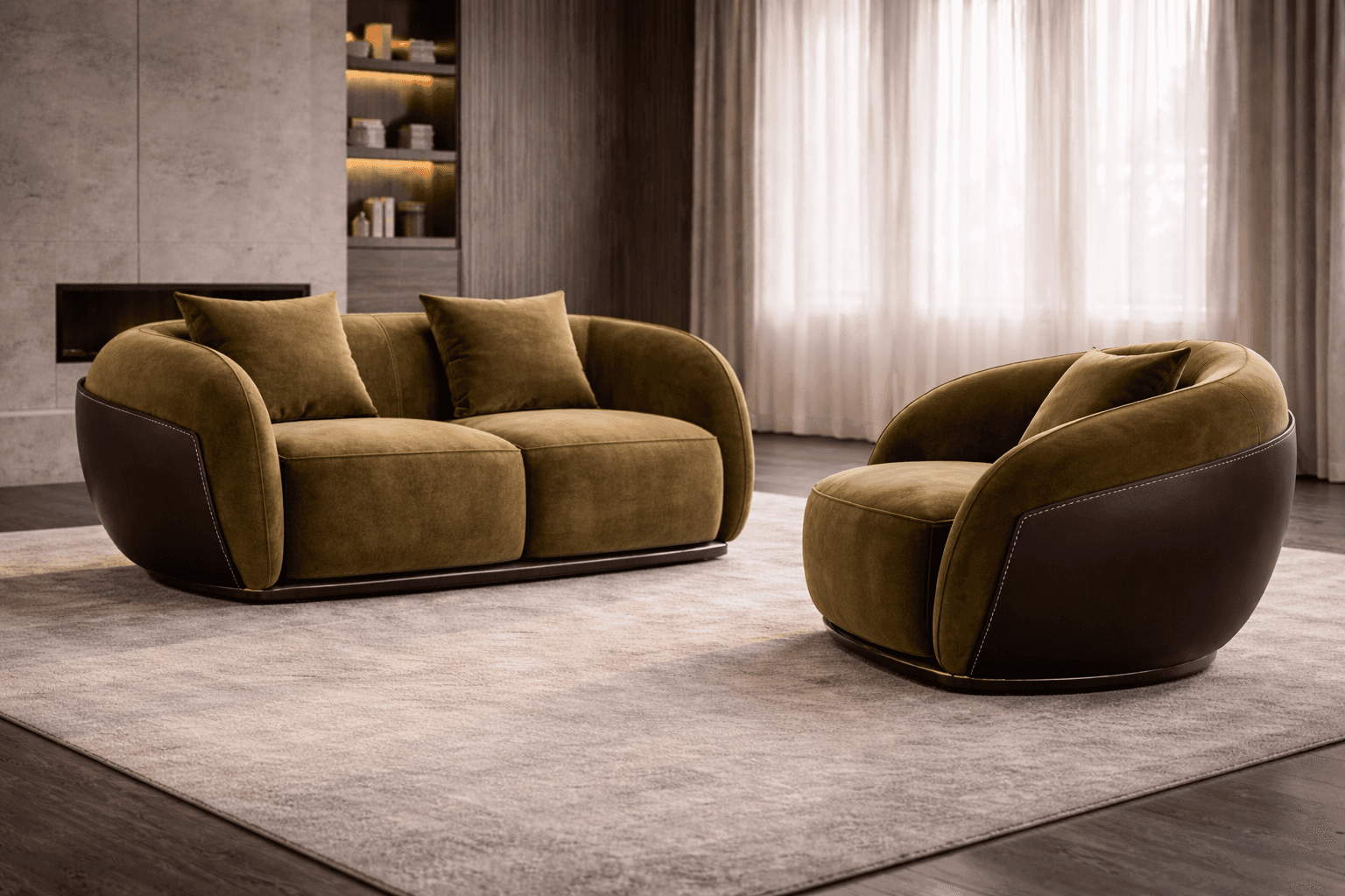 Designed for a private client, this chair combines a pure leather backrest, a wooden swivel base with brass inserts, and a cozy upholstered seat. The piece highlights a refined mix of materials and subtle color variations, blending comfort, craftsmanship, and contemporary elegance.