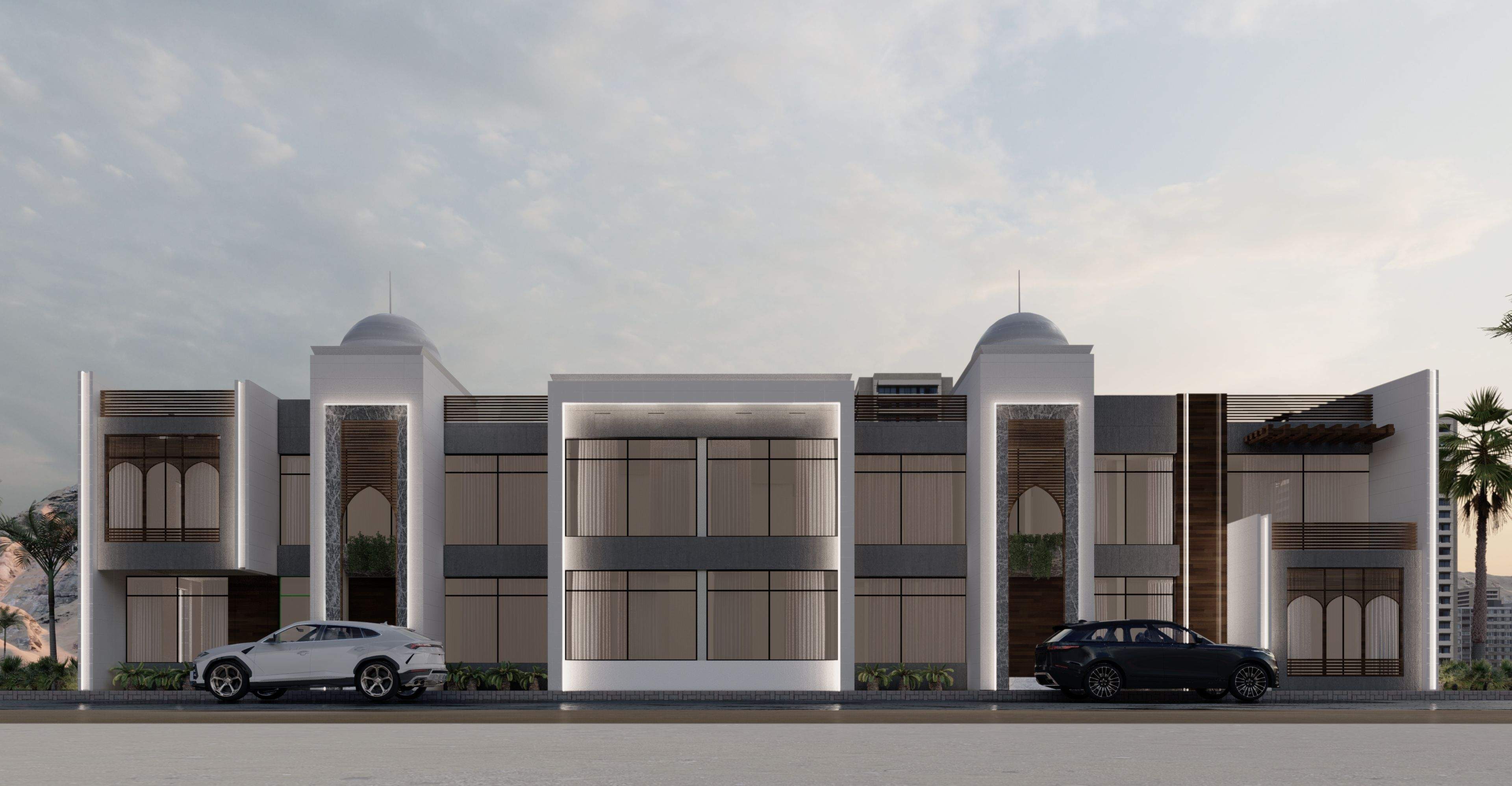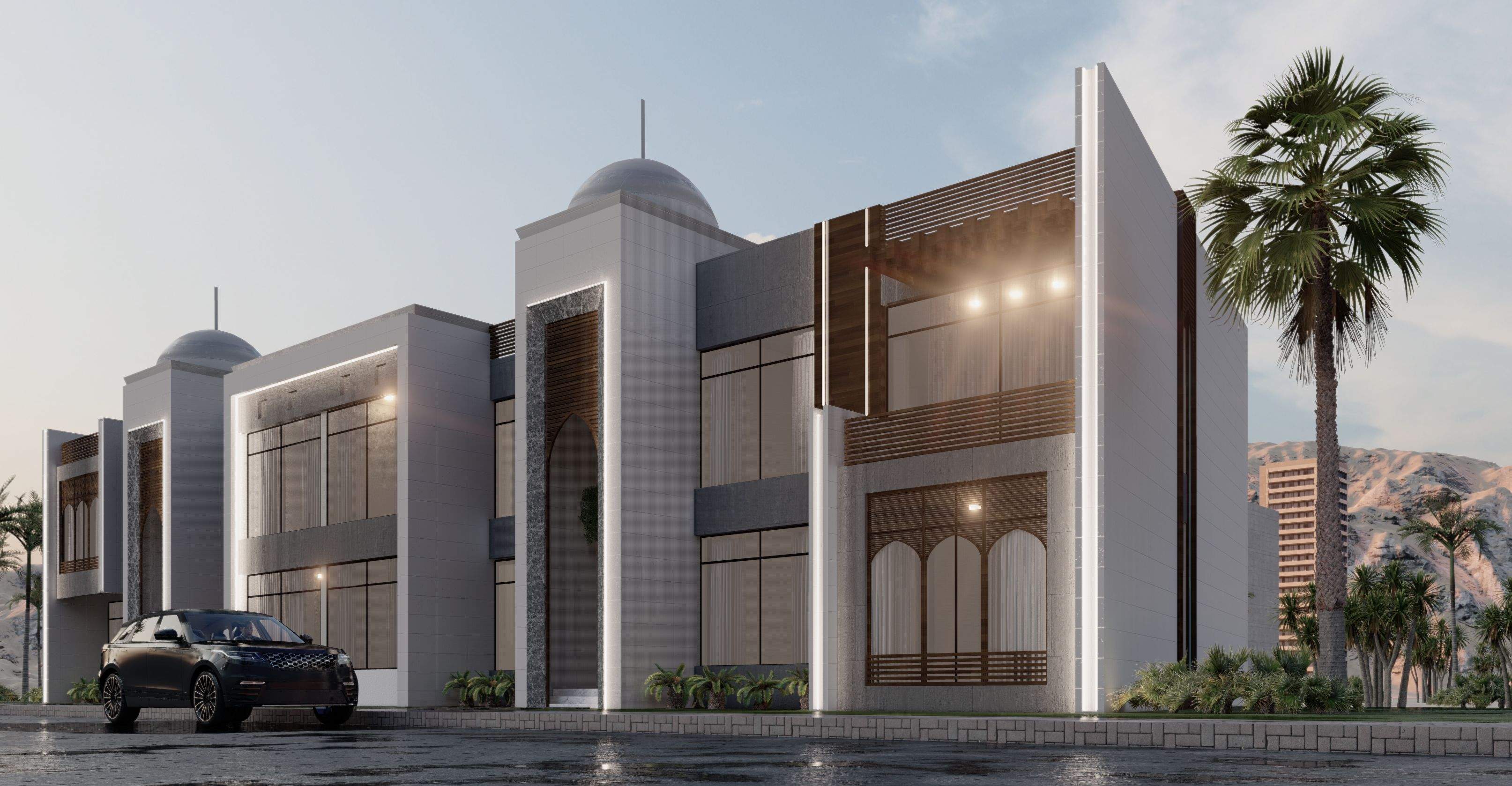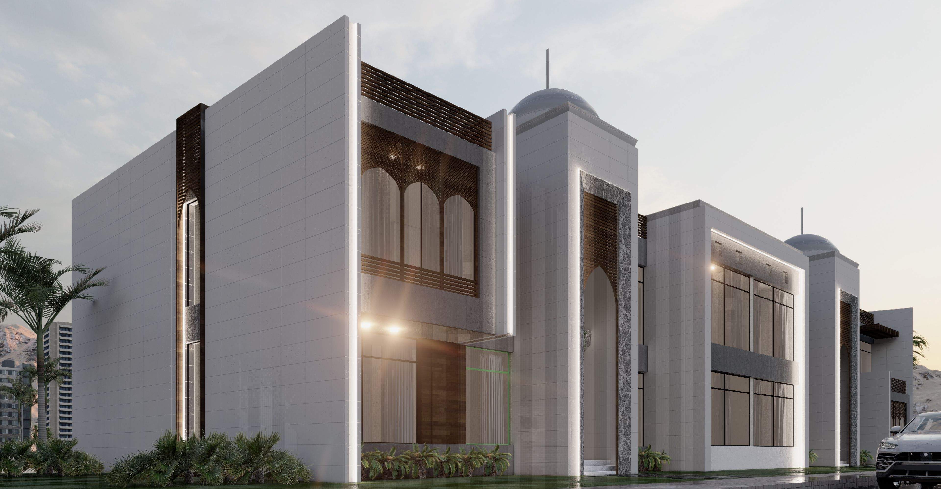 A modern reinterpretation of traditional Arabic architecture, featuring clean lines, arched details, domed elements, and wooden screens. The design balances contemporary living with cultural authenticity.