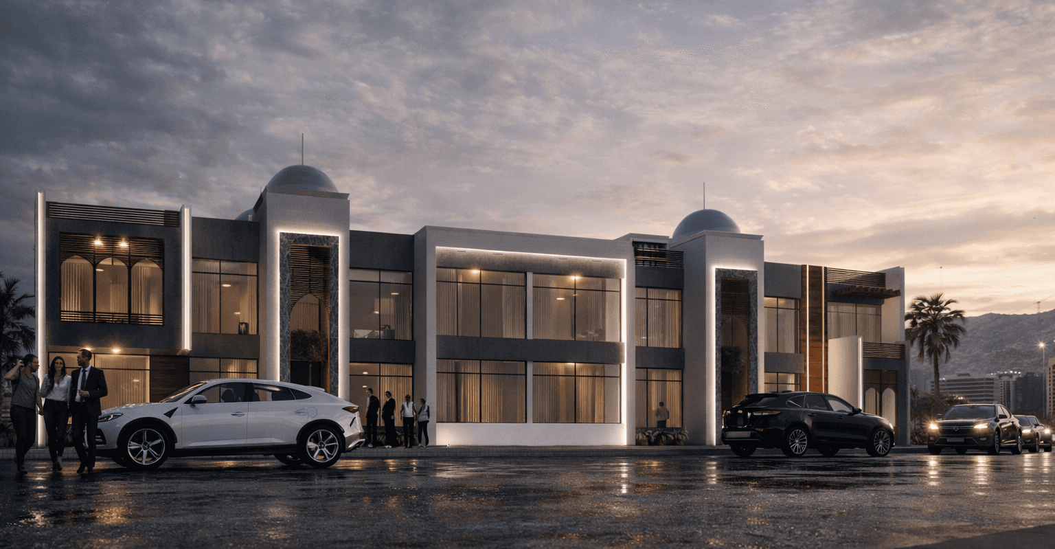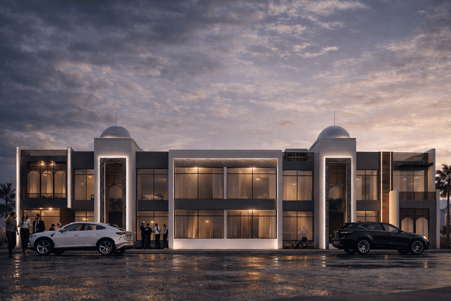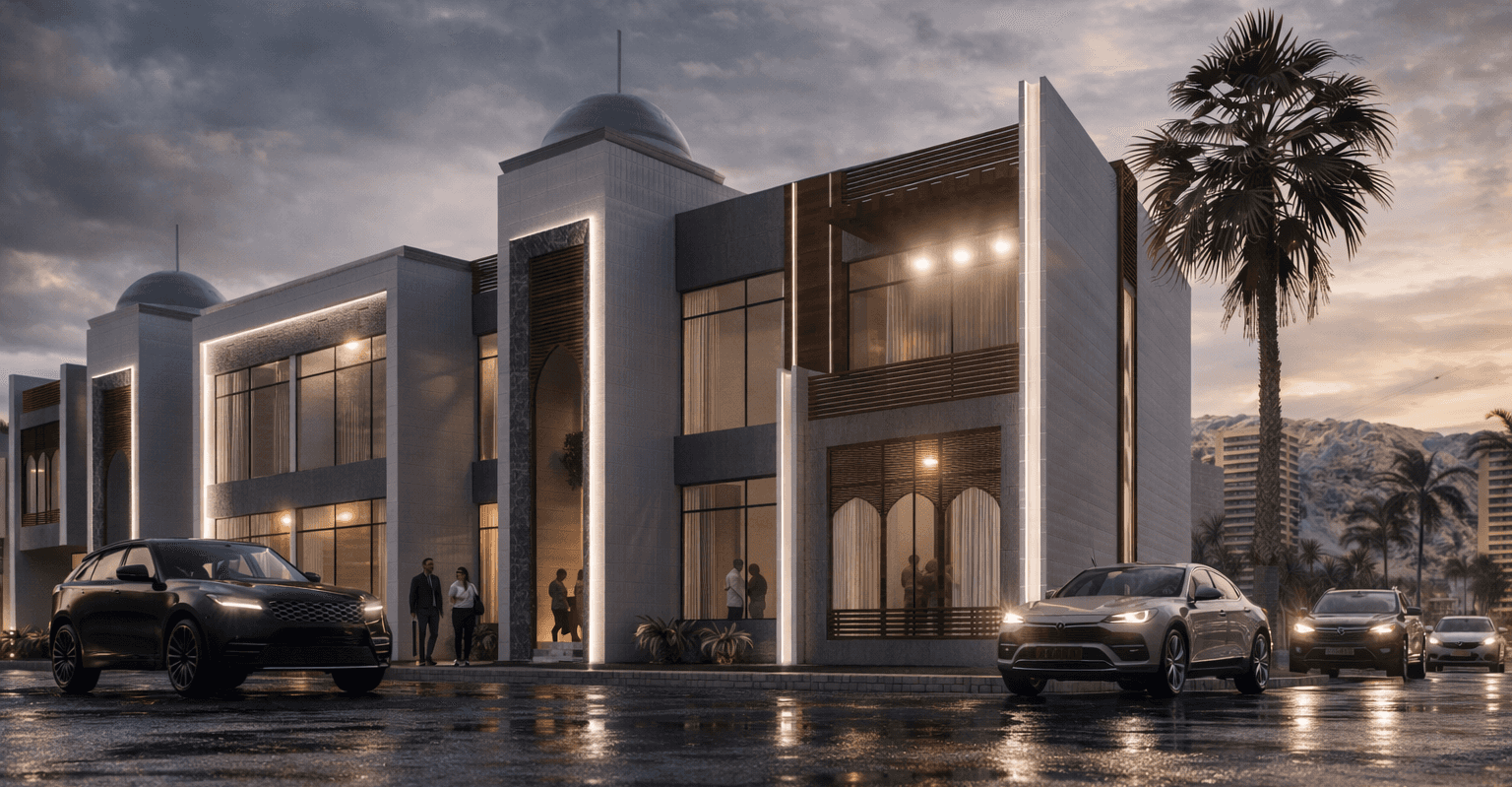 A modern reinterpretation of traditional Arabic architecture, featuring clean lines, arched details, domed elements, and wooden screens. The design balances contemporary living with cultural authenticity.