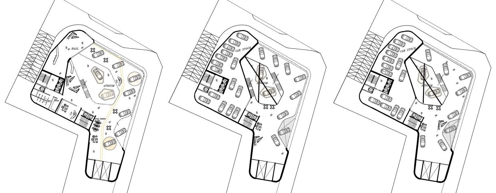 The ground level functions as a premium car showroom with high visibility and fluid spaces, while the upper tower accommodates corporate offices, reflecting innovation, performance, and luxury aligned with the automotive identity.