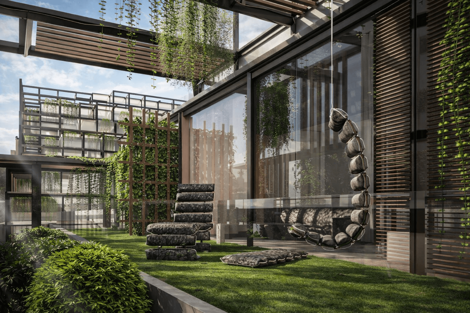The concept highlights flexibility and integration—offices occupy the lower and mid-levels with open, collaborative spaces, while upper terraces transition into residential units with private outdoor areas. The exposed structural grid defines the identity of the building, expressing order, rhythm, and modern urban living while allowing natural light, greenery, and interaction between spaces.