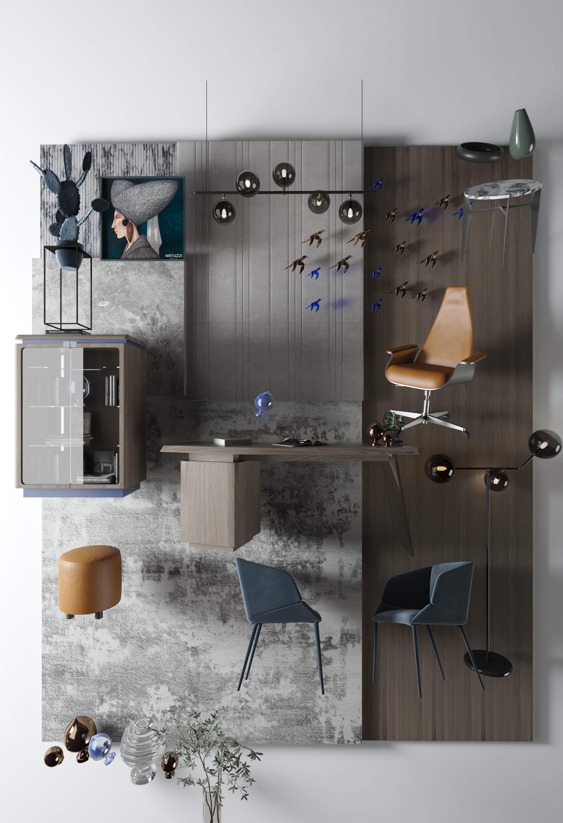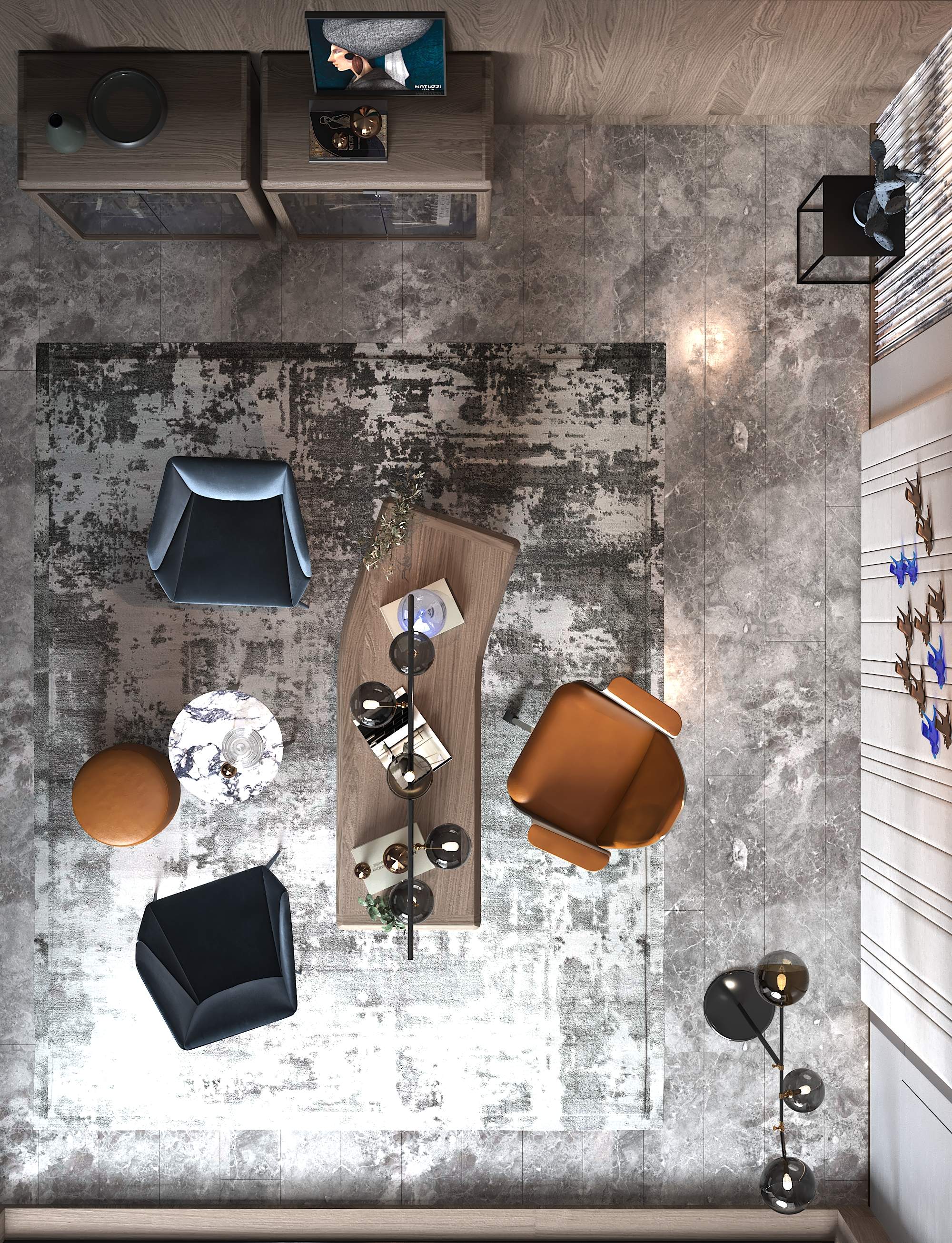 The scope of work included interior design, furniture selection, and a 3D mood board. The open layout was enriched with unique wall art, sculptural lighting, and a neutral palette of light gray and beige, accented with bold blue and warm orange. High-end materials and carefully curated furniture from Reflex, Adriani Rossi, and Natuzzi Italia were integrated to elevate both style and functionality