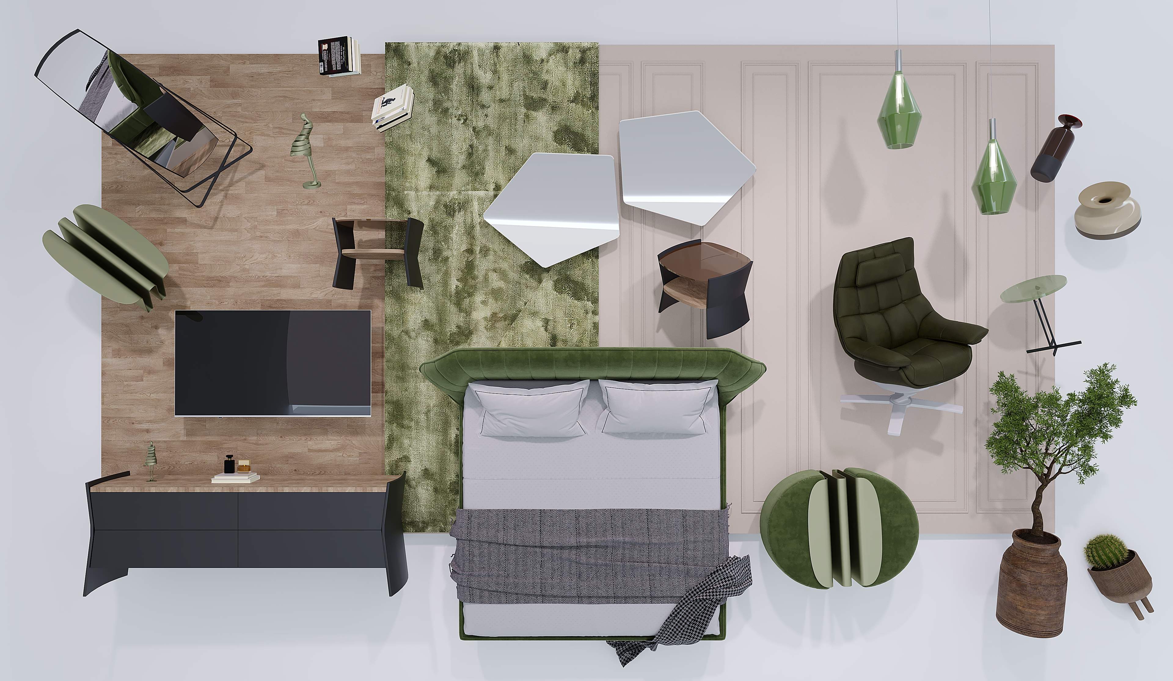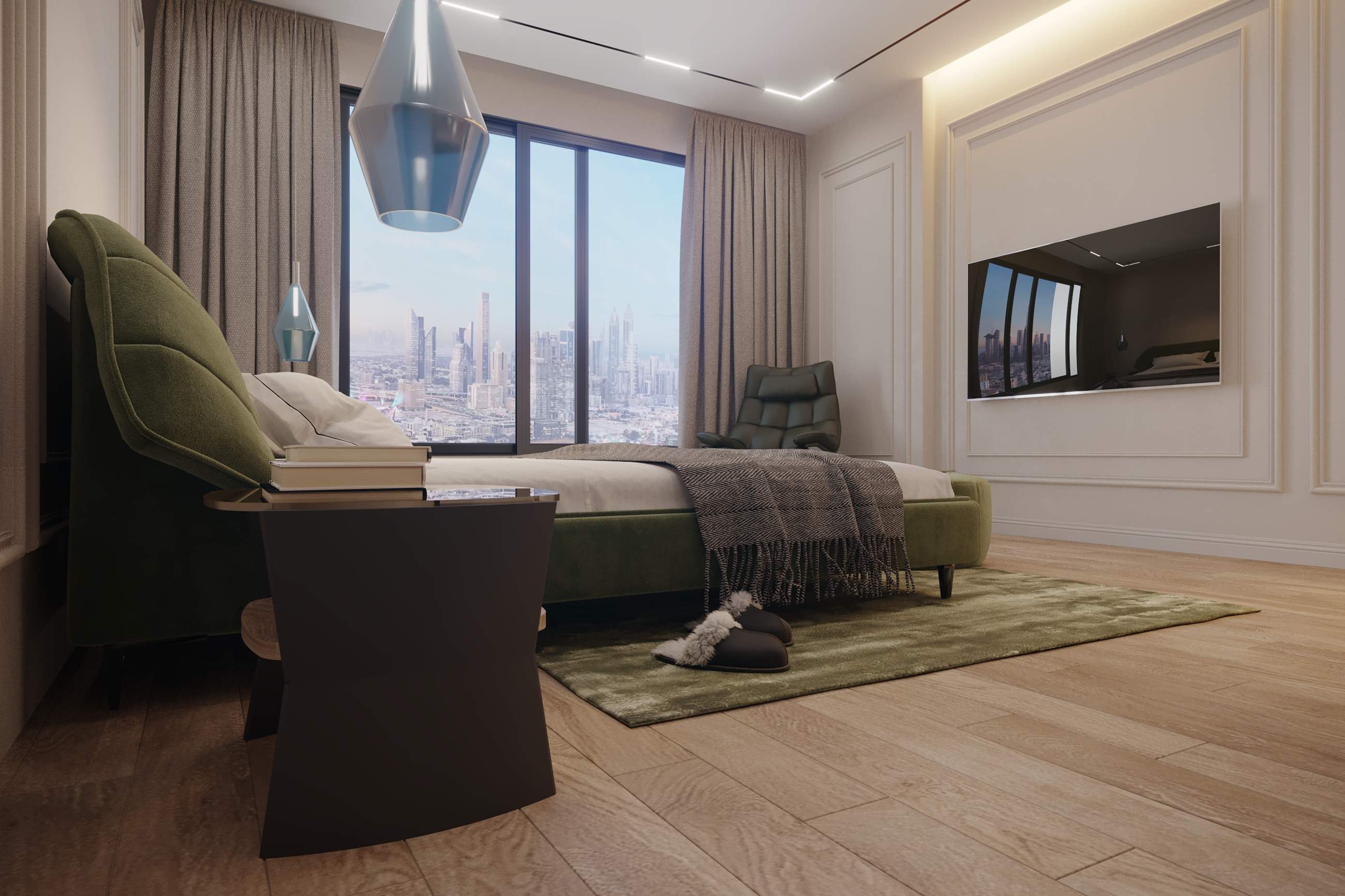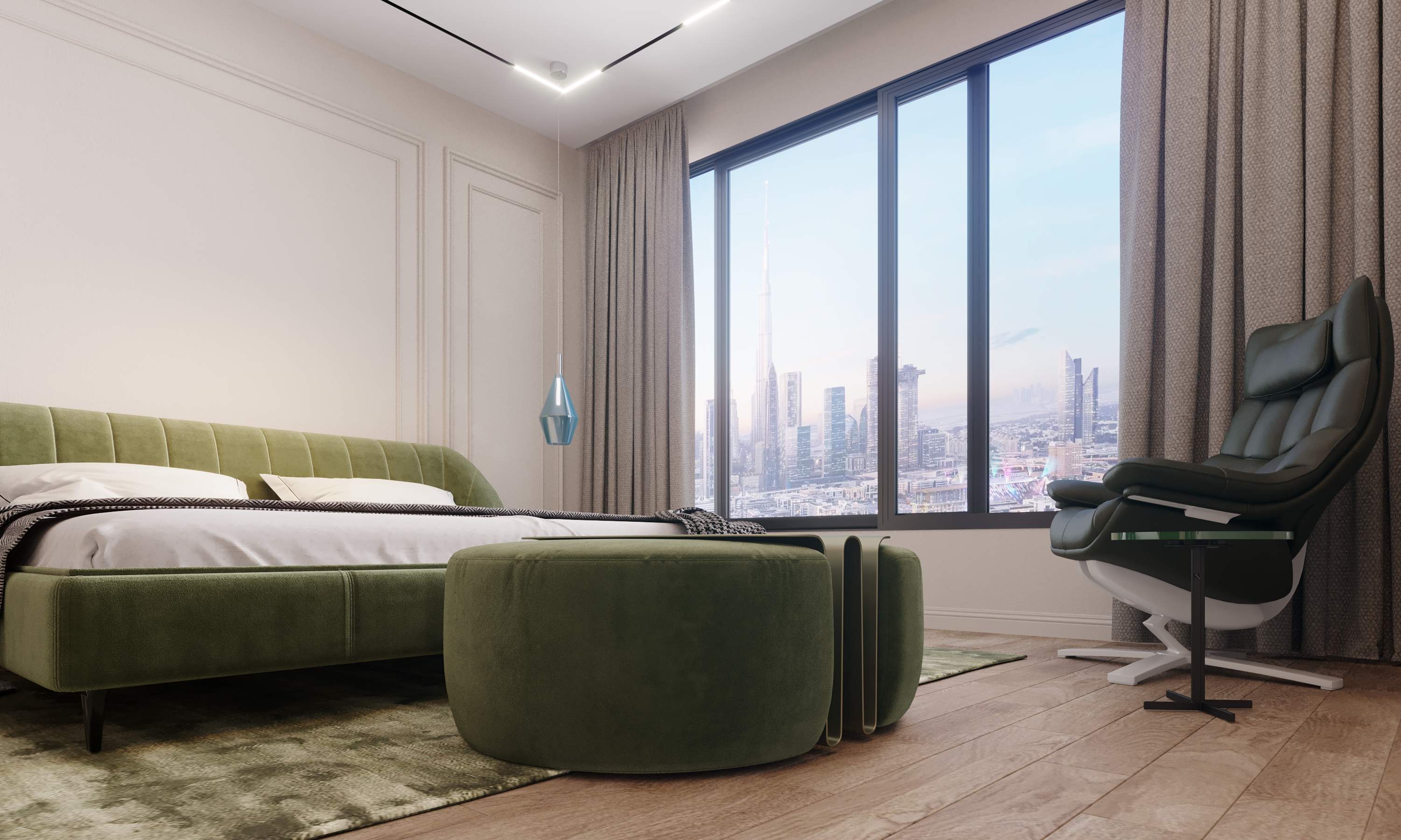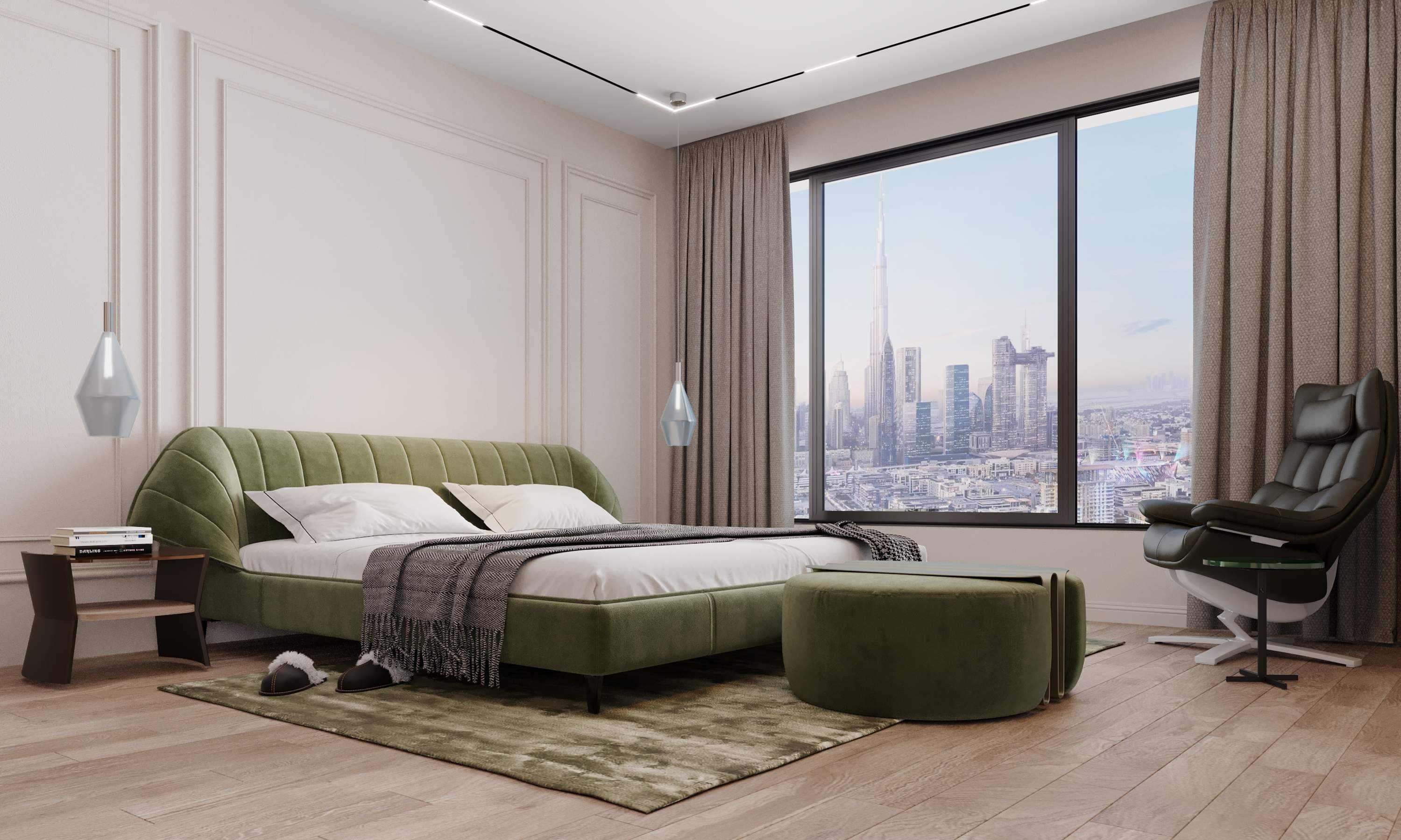The design features a plush olive-green velvet bed, neutral-toned walls, and a floor-to-ceiling window framing views of the Burj Khalifa. Refined elements such as recessed lighting and dark furniture add depth and warmth.