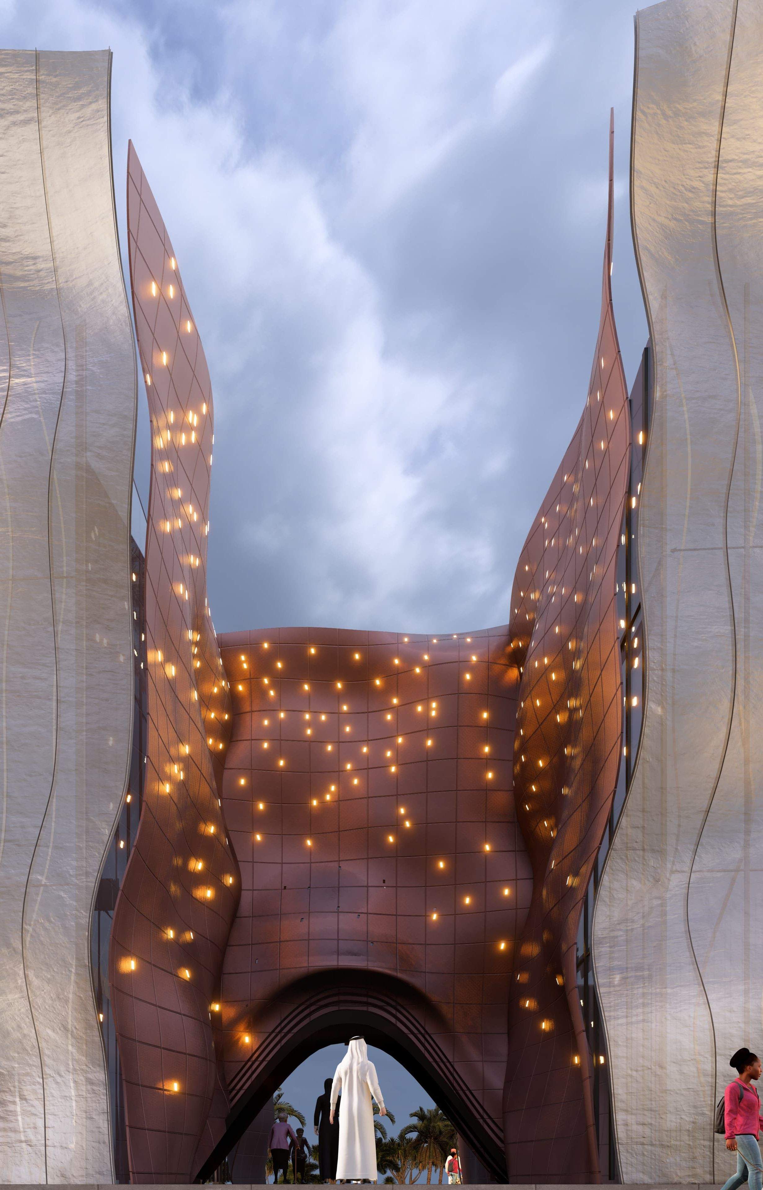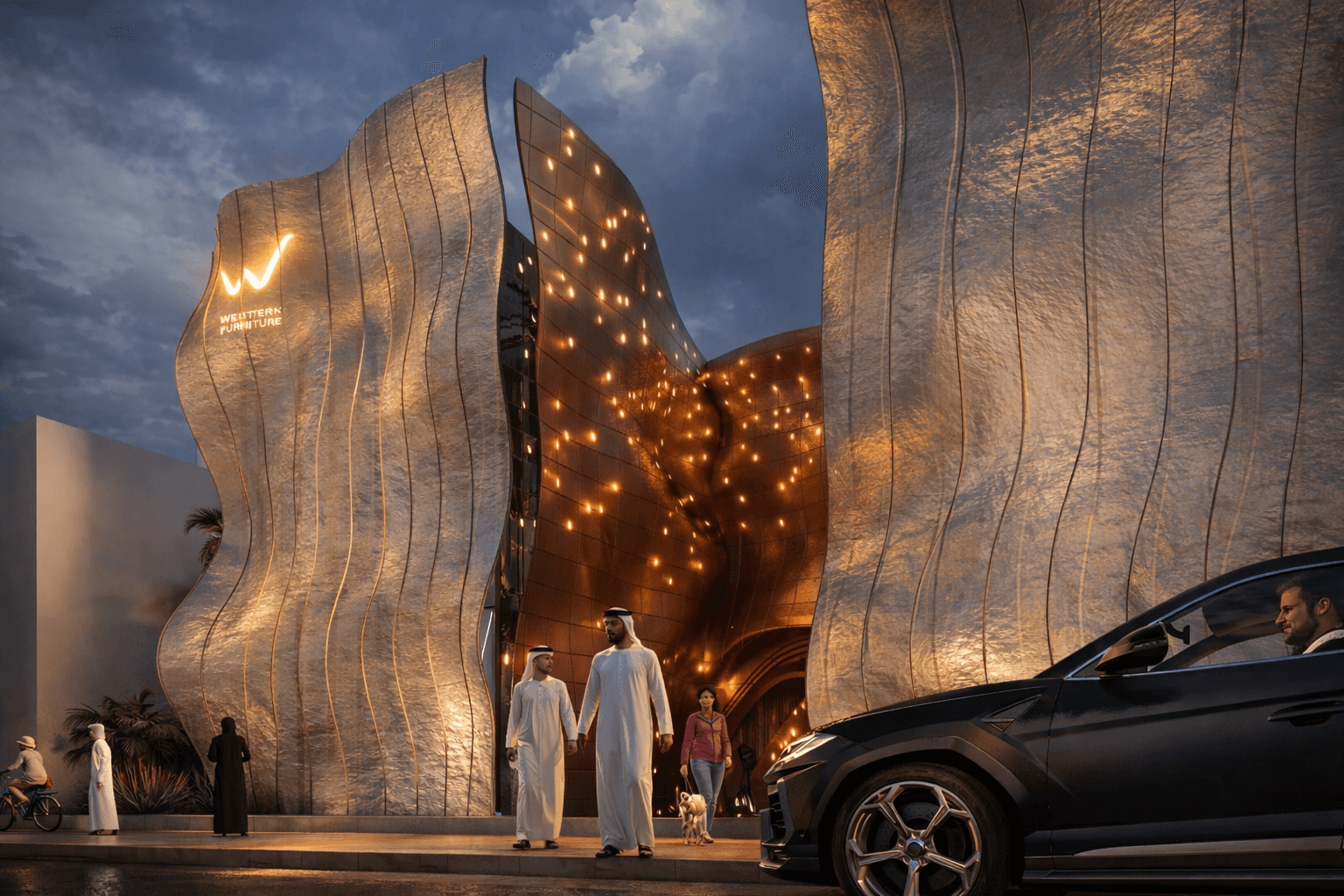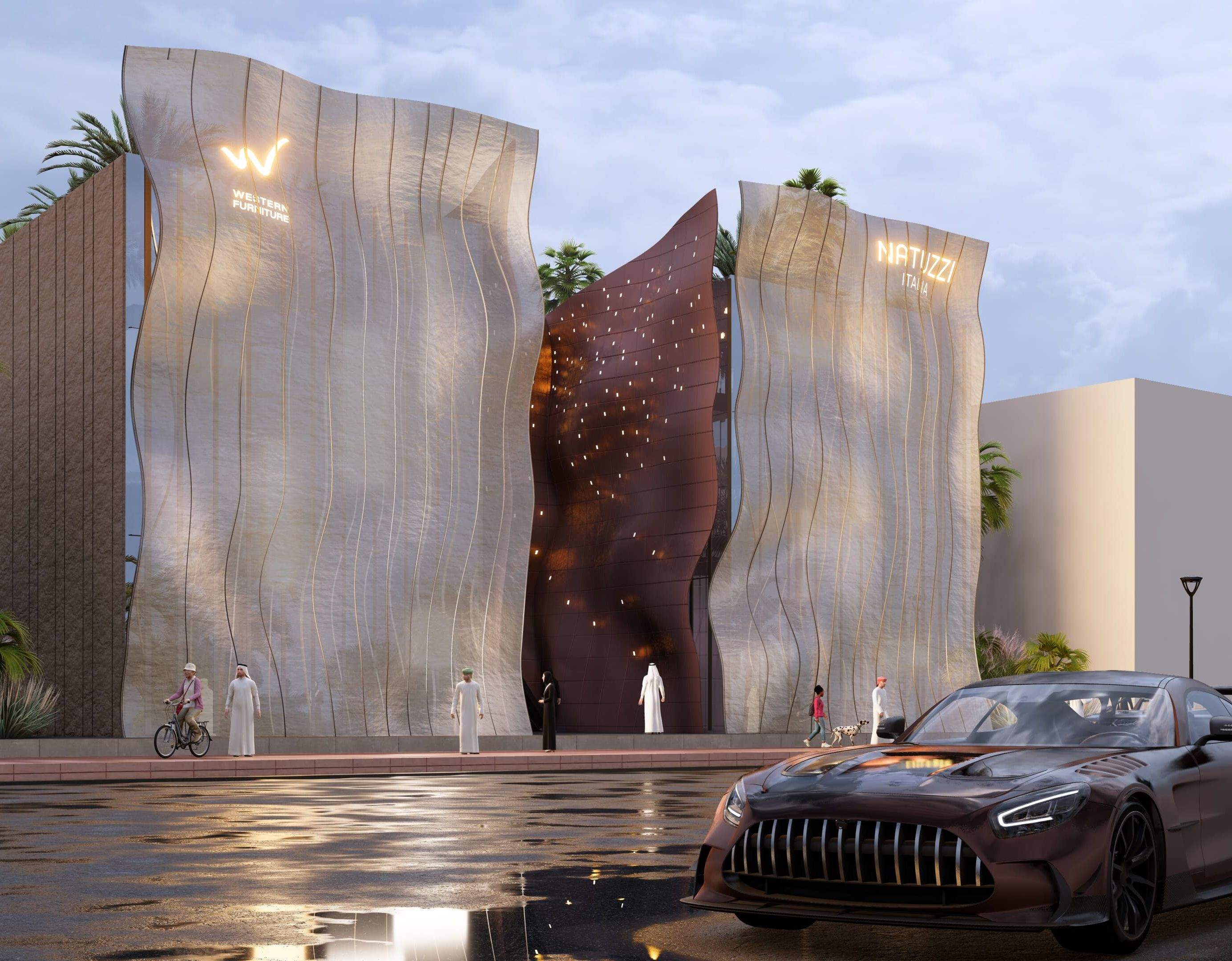 A luxury retail showroom concept defined by sculptural, flowing façades and a dramatic central atrium. The design blends organic architectural forms, warm metallic textures, and refined lighting to create a strong brand presence, an iconic street identity, and an immersive arrival experience that reflects premium craftsmanship and exclusivity..