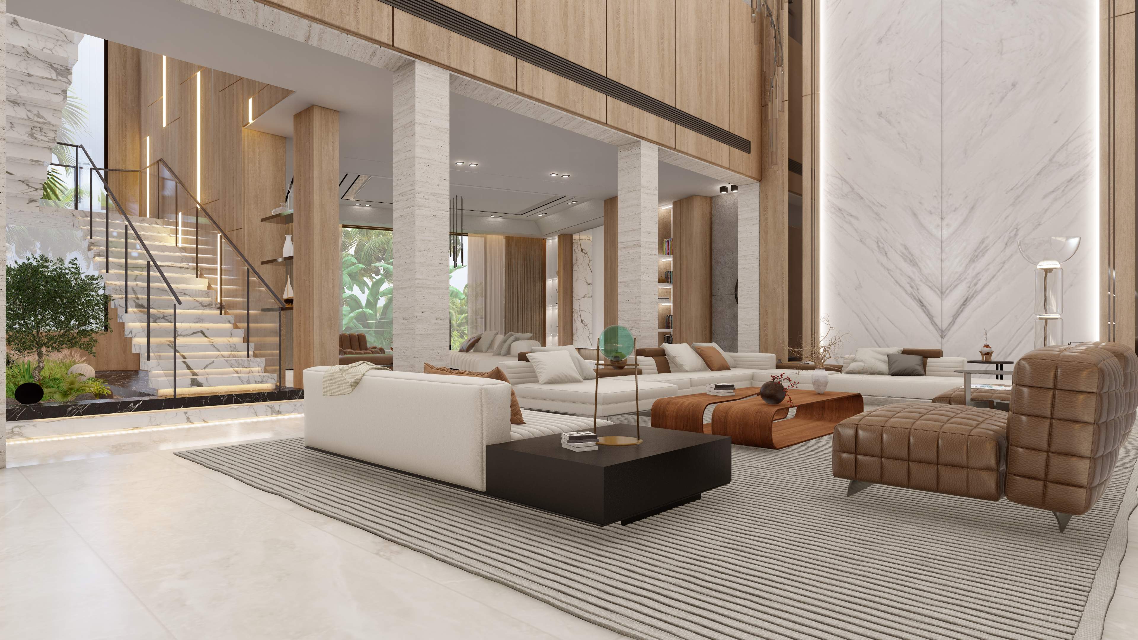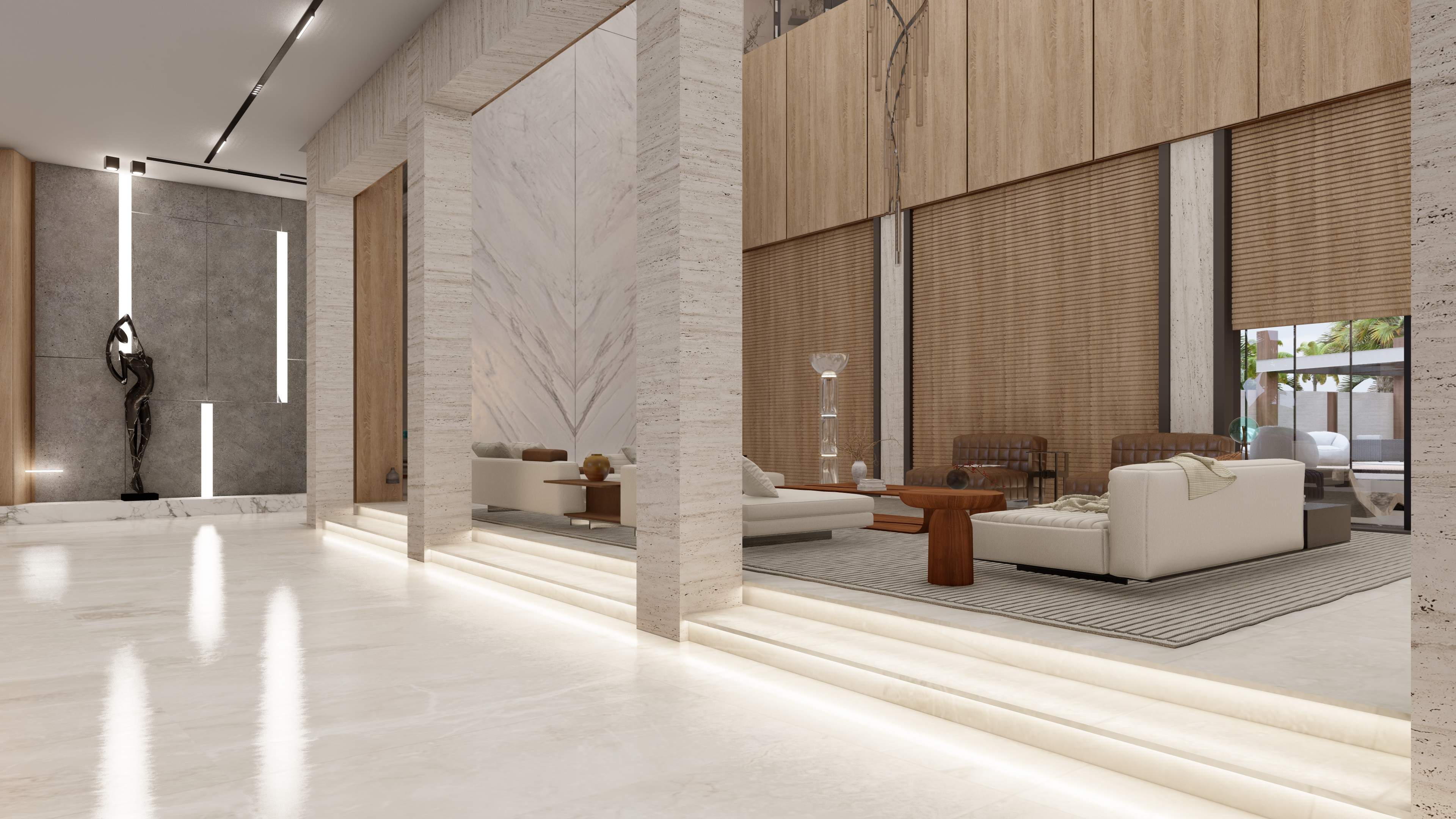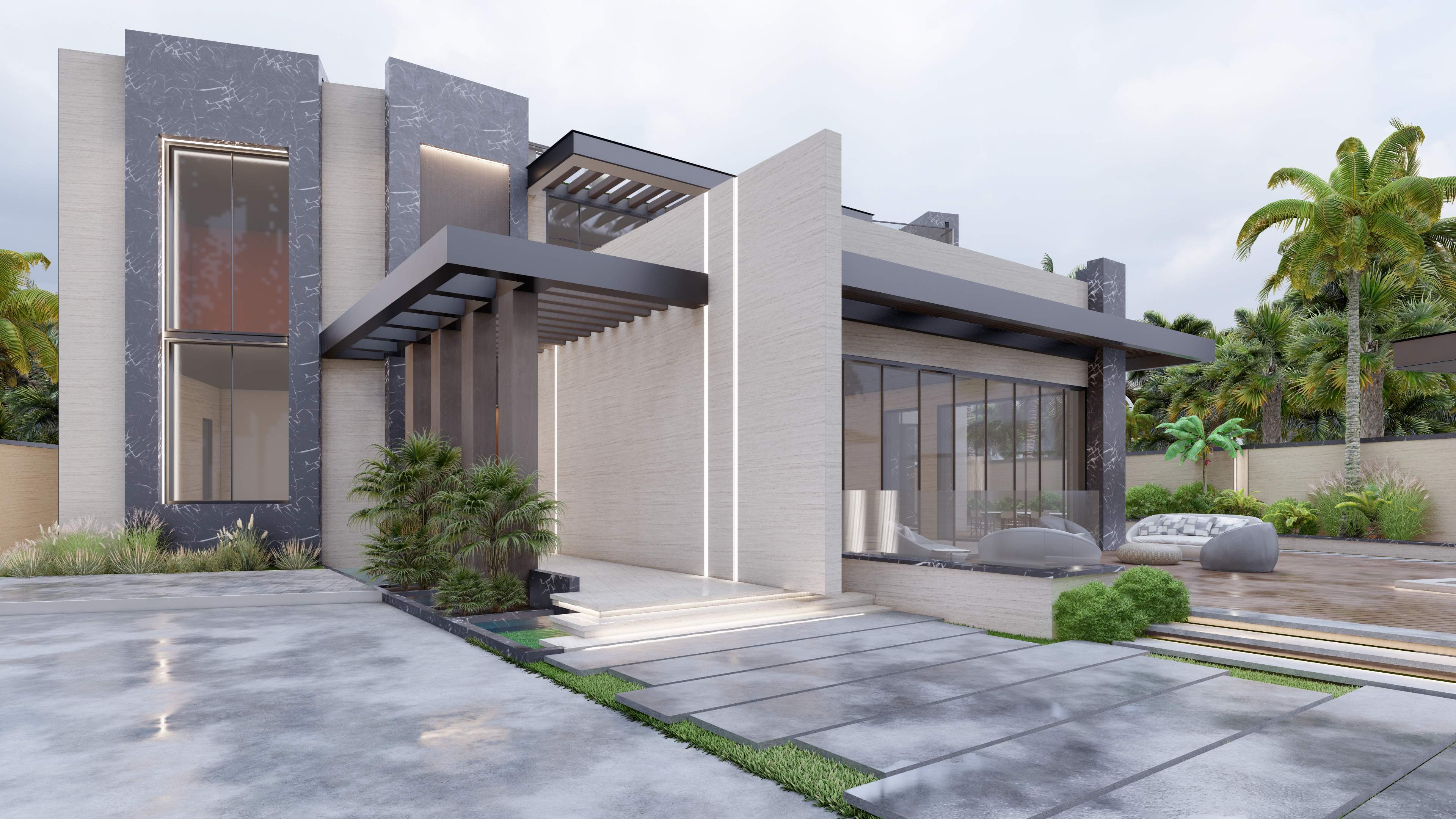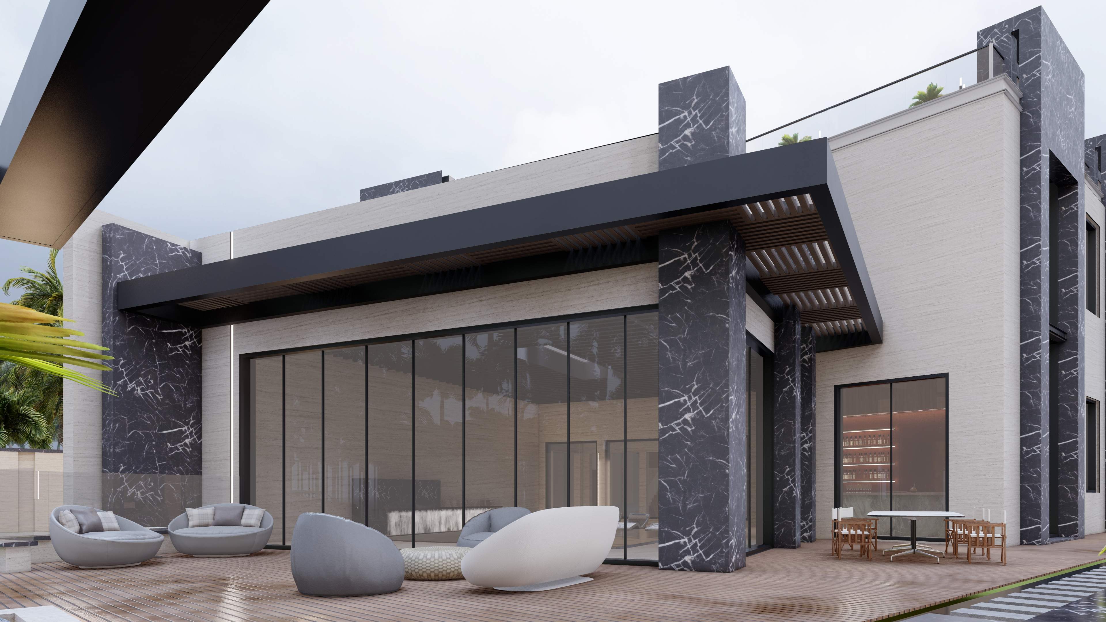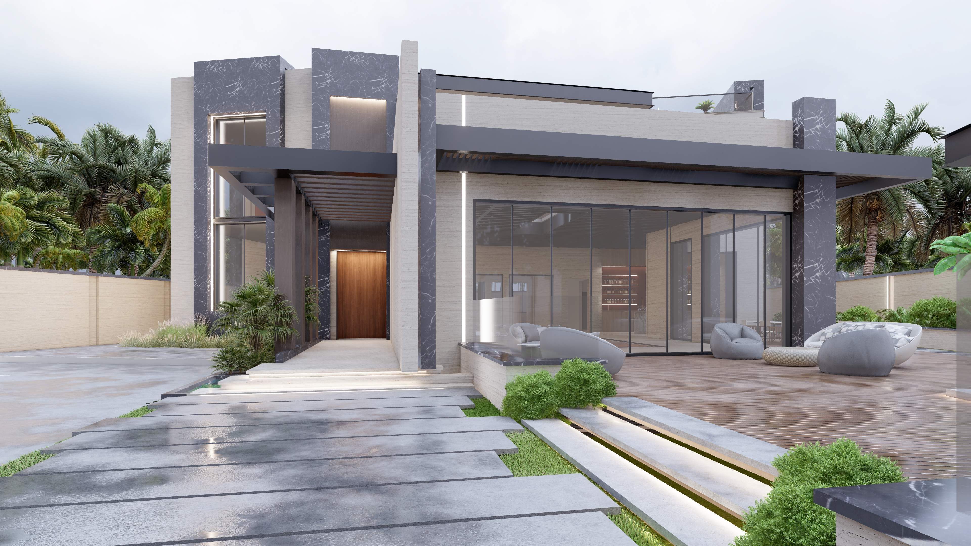 Led the full renovation scope—interior, exterior, and landscaping. The design blends modern architecture with grey tones, Arablar wood, and premium materials like Travertino and Nero Marquina marble, achieving a refined balance of elegance and timeless luxury. A rooftop terrace frames panoramic views of the Burj Al Arab, while the interiors embody calm, sophisticated living.