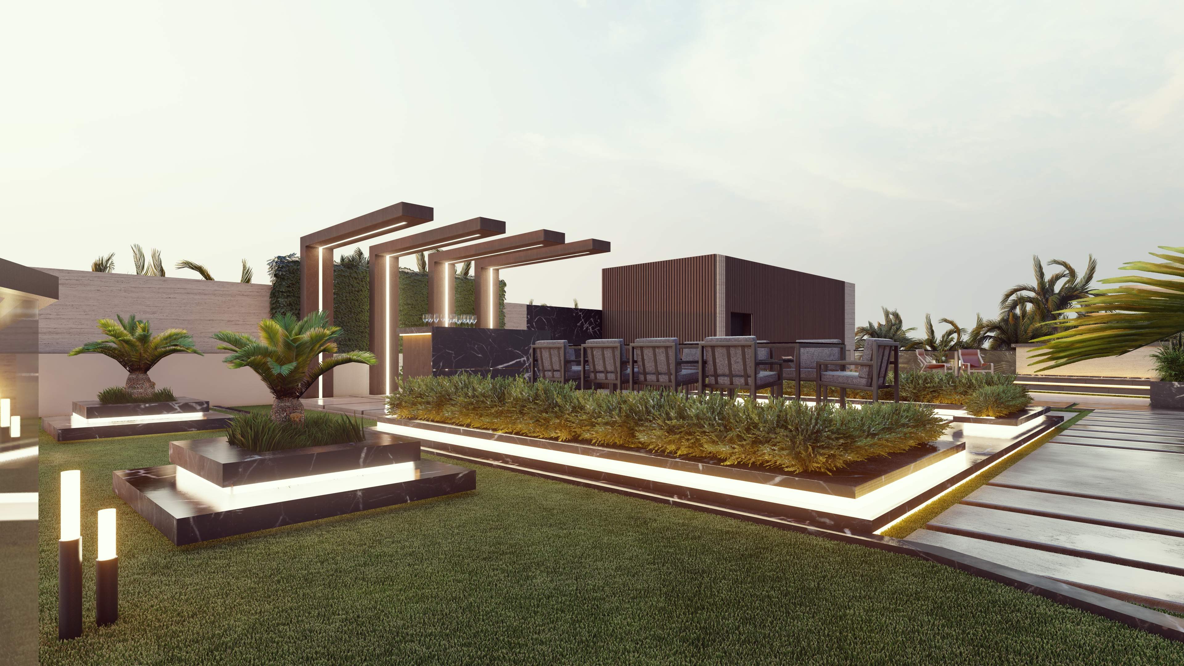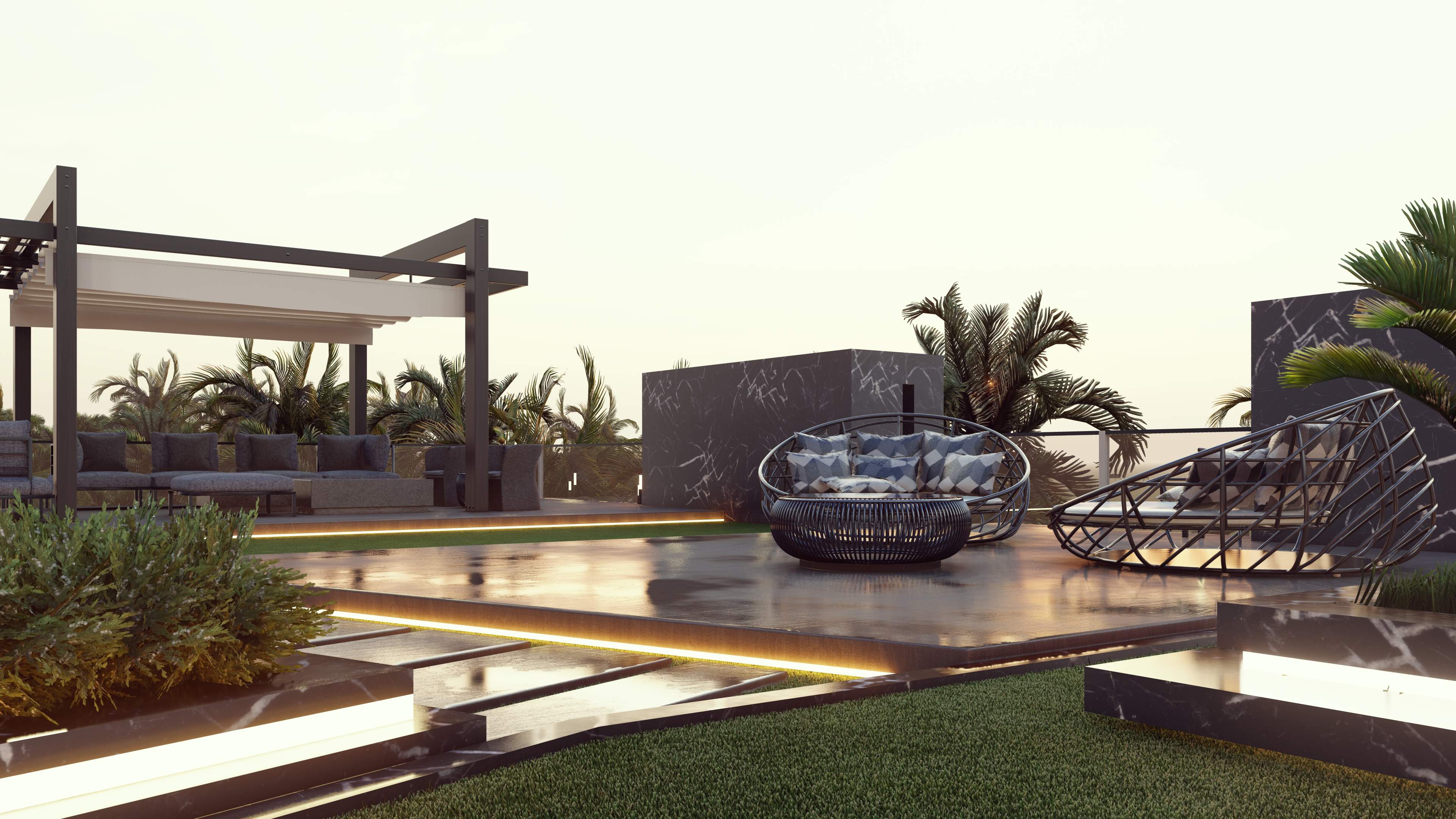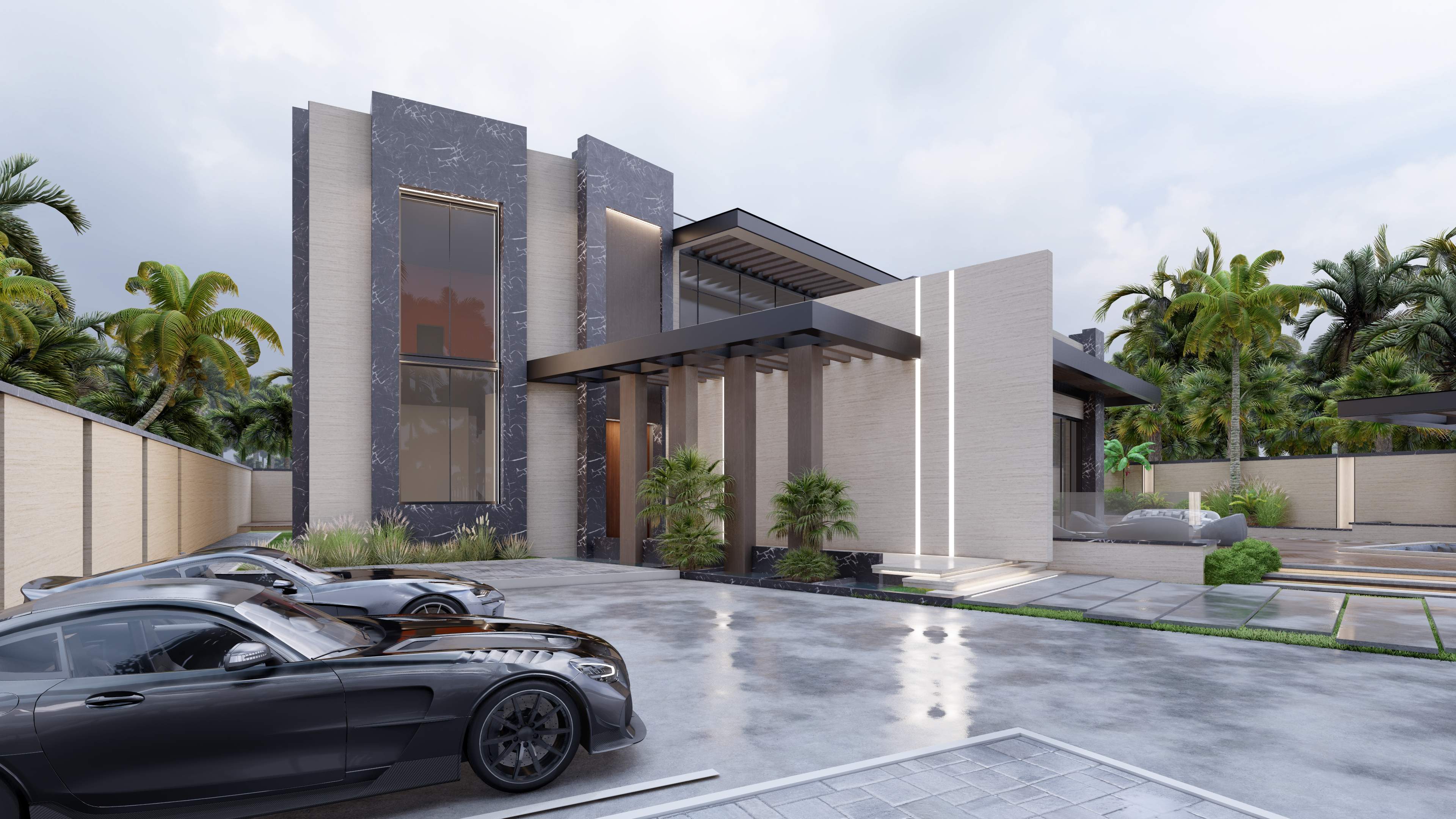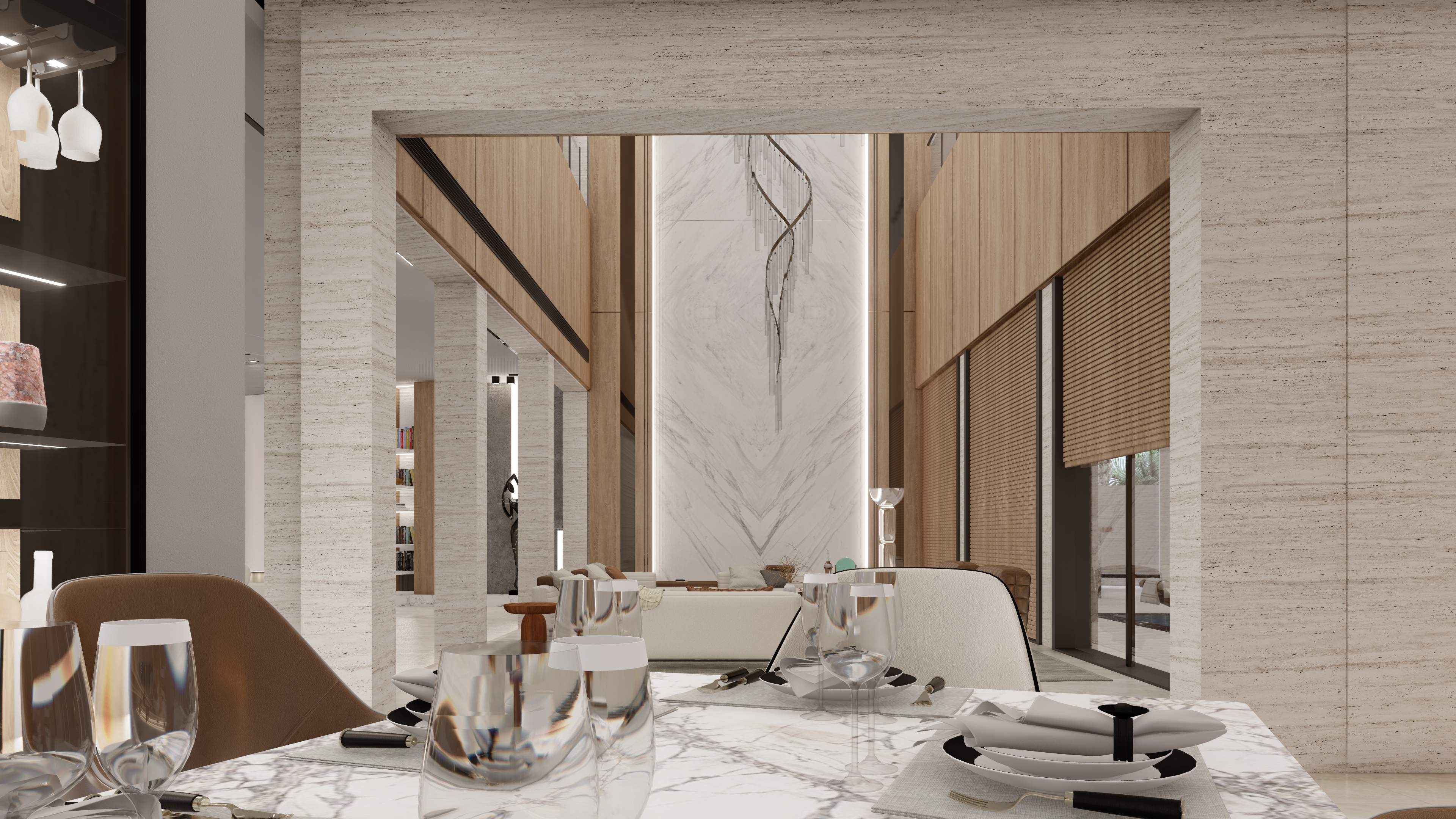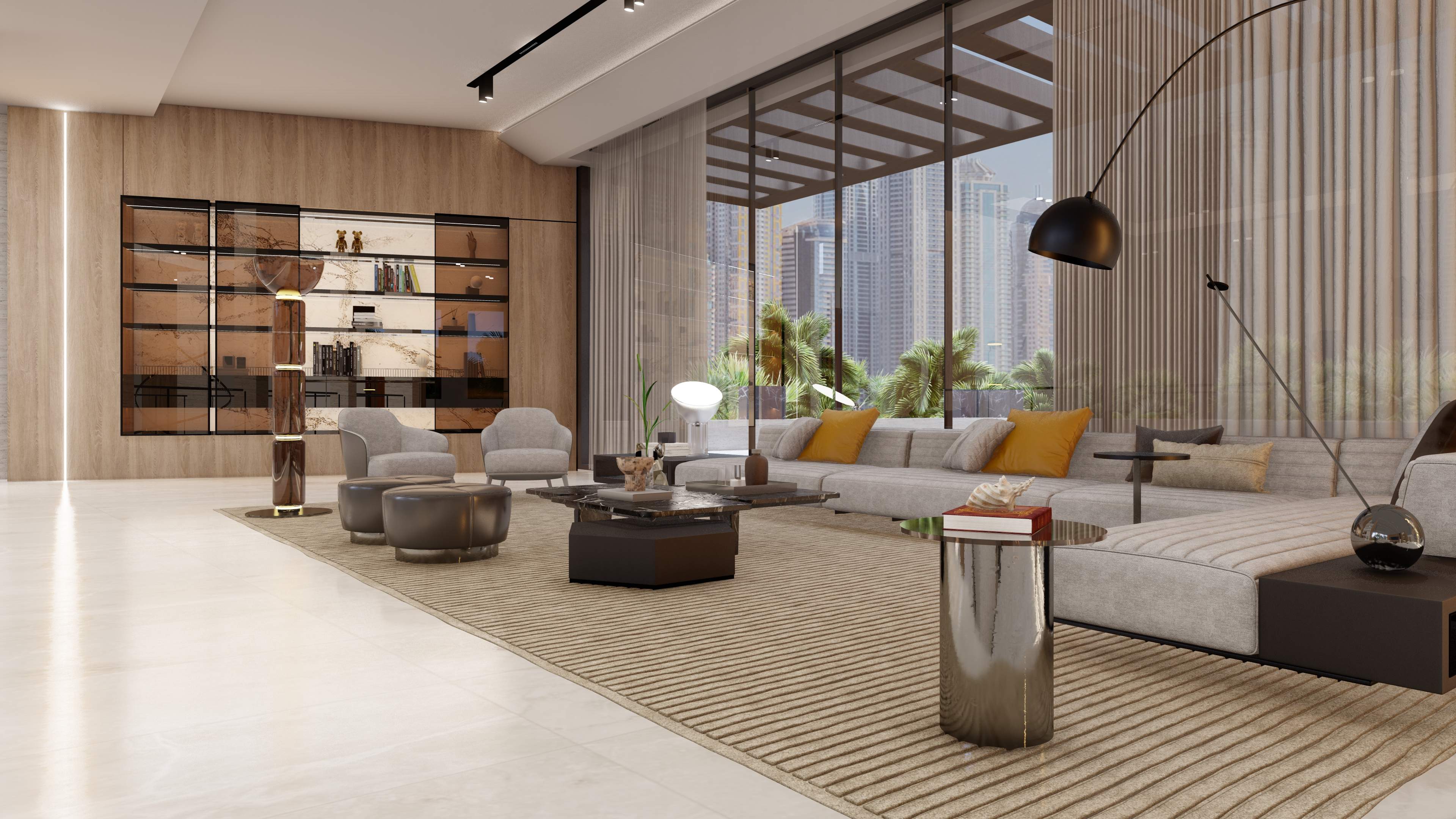 Led the full renovation scope—interior, exterior, and landscaping. The design blends modern architecture with grey tones, Arablar wood, and premium materials like Travertino and Nero Marquina marble, achieving a refined balance of elegance and timeless luxury. A rooftop terrace frames panoramic views of the Burj Al Arab, while the interiors embody calm, sophisticated living.