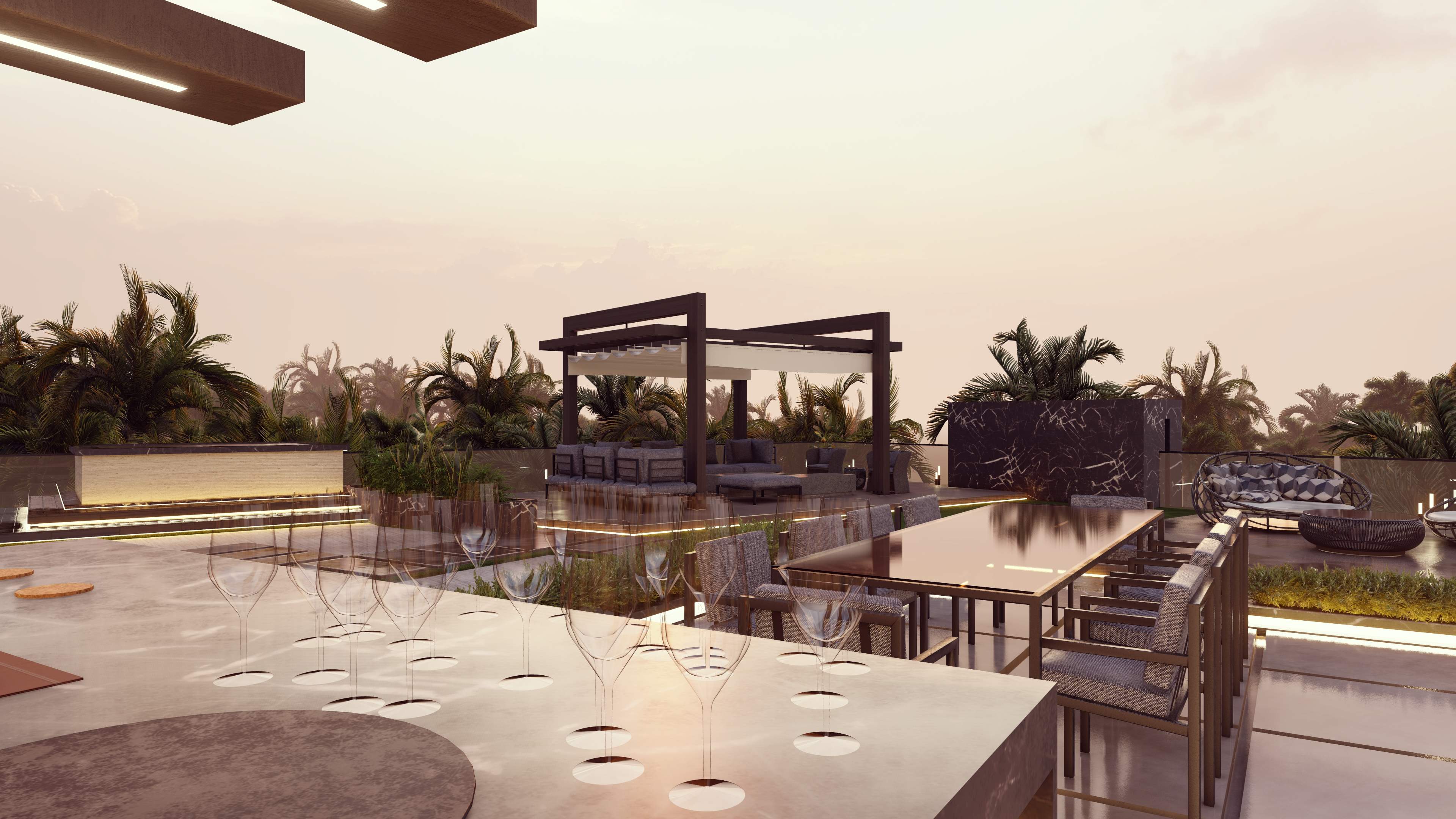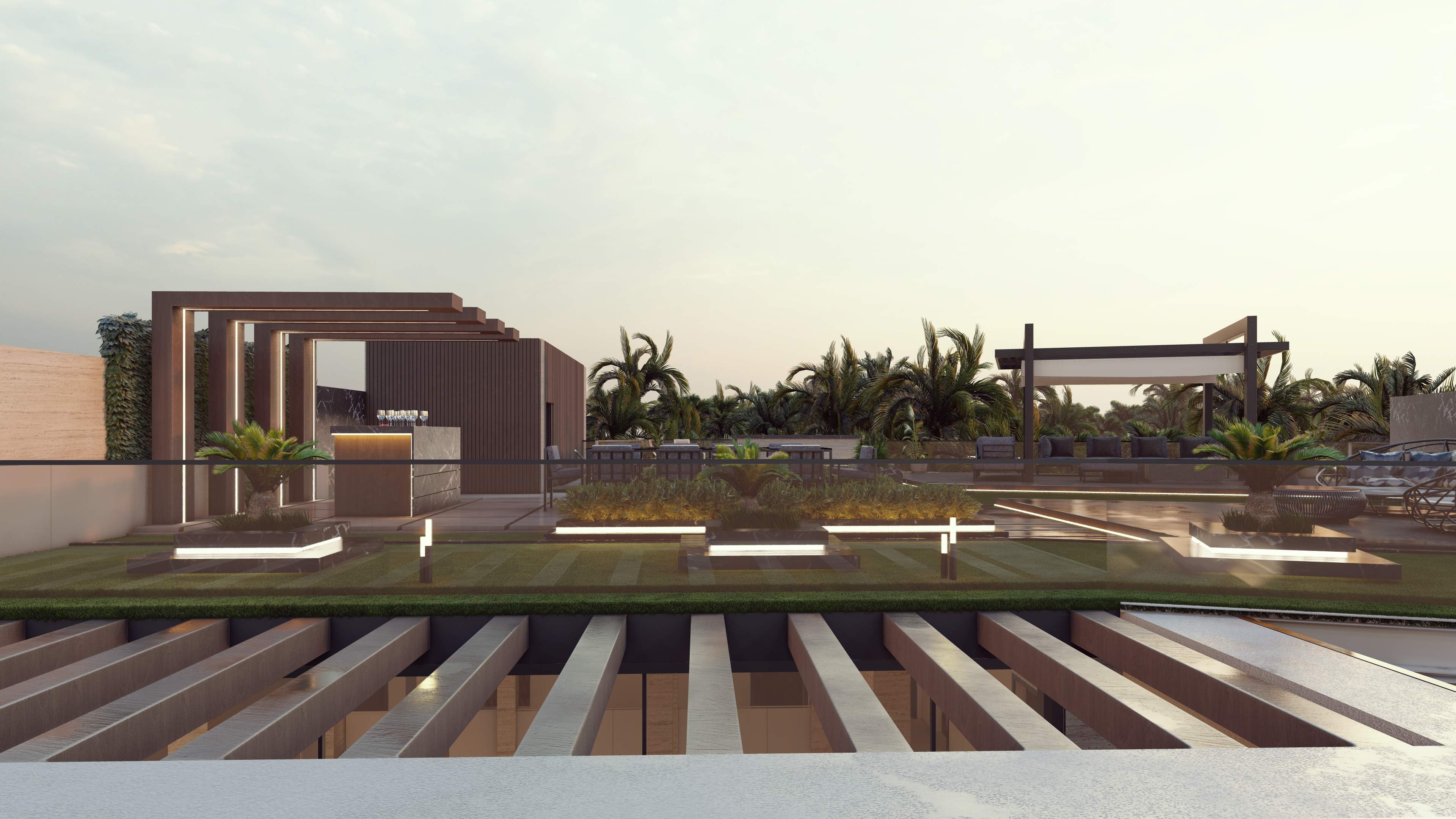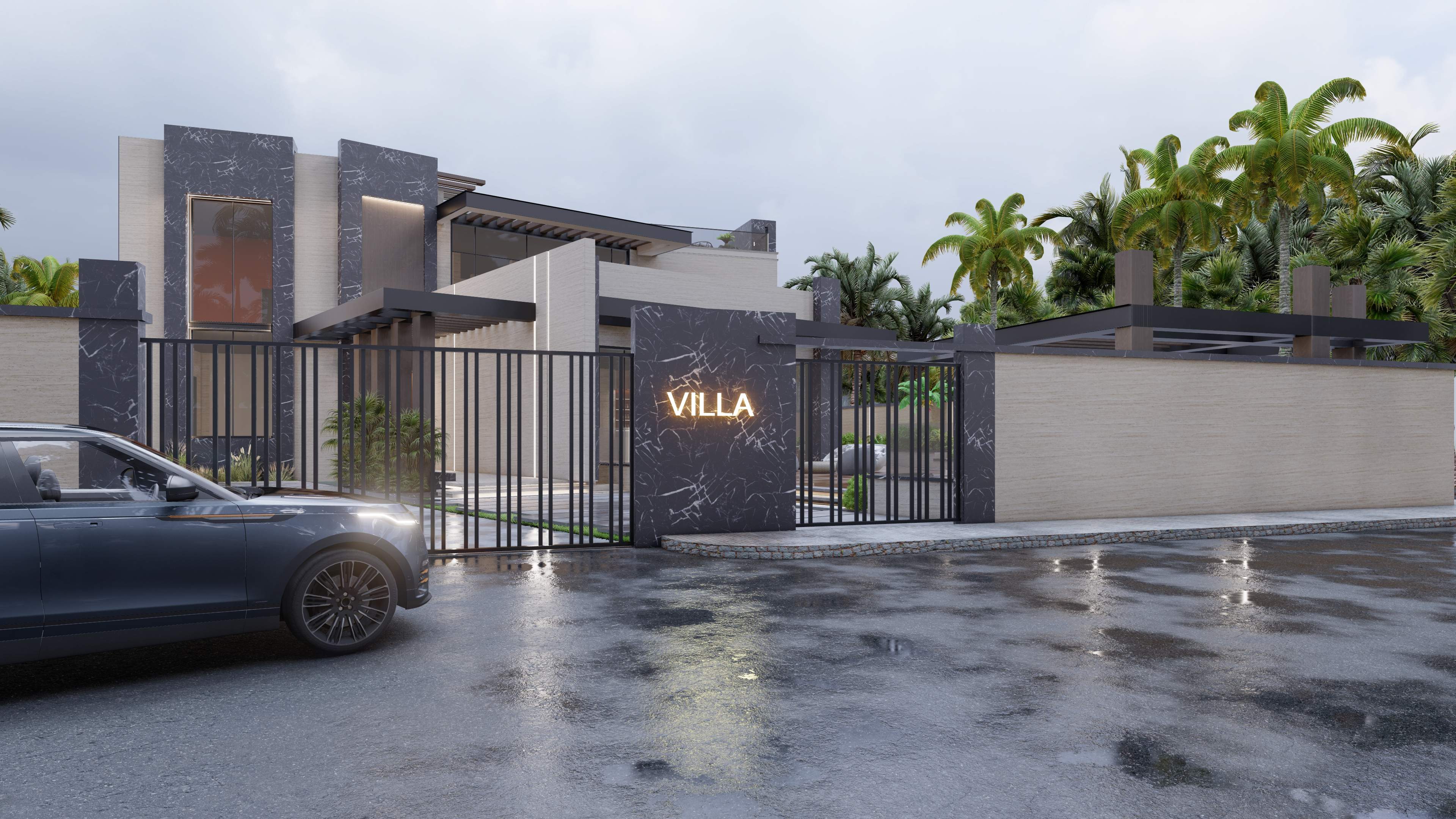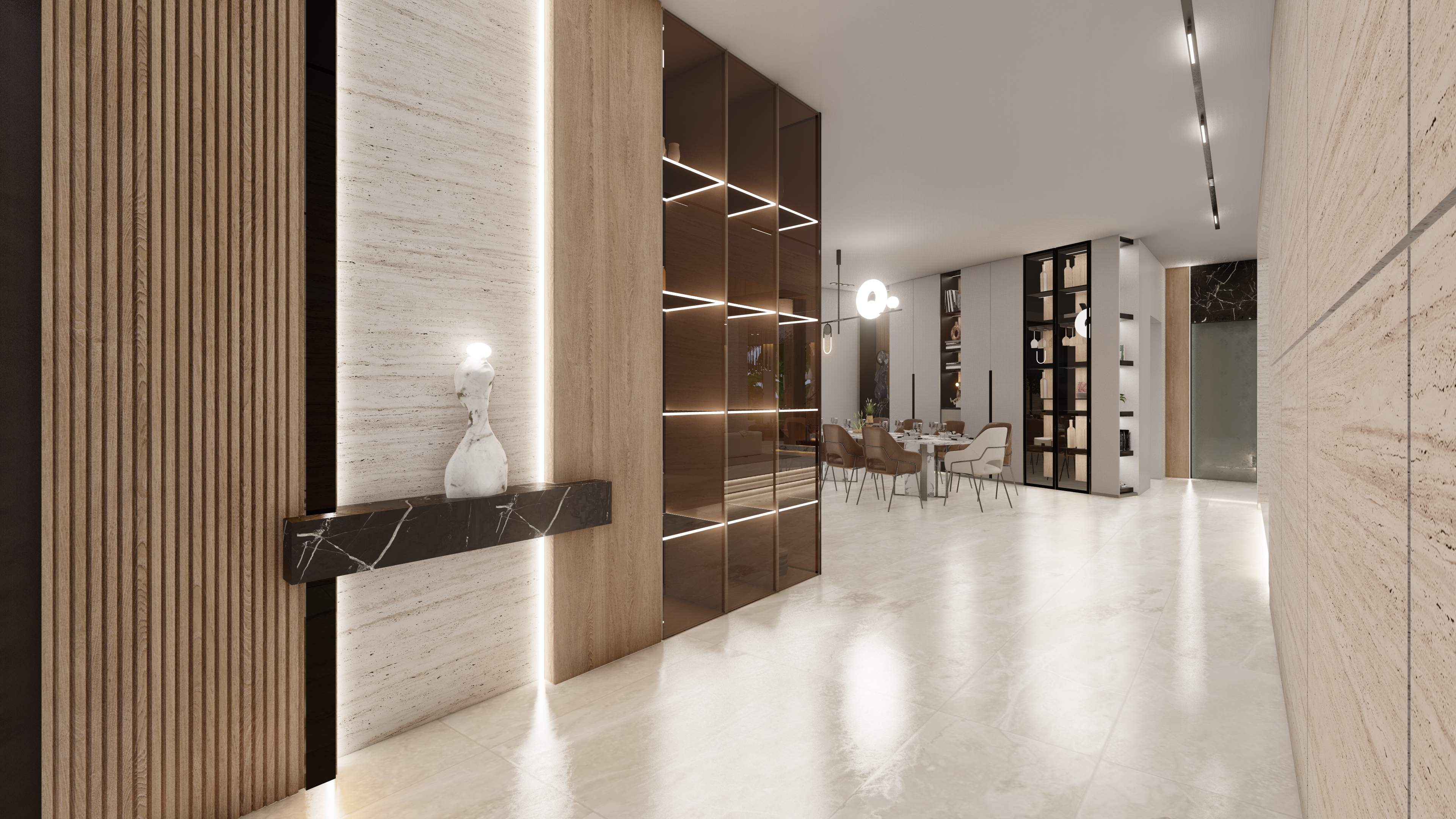 Led the full renovation scope—interior, exterior, and landscaping. The design blends modern architecture with grey tones, Arablar wood, and premium materials like Travertino and Nero Marquina marble, achieving a refined balance of elegance and timeless luxury. A rooftop terrace frames panoramic views of the Burj Al Arab, while the interiors embody calm, sophisticated living.