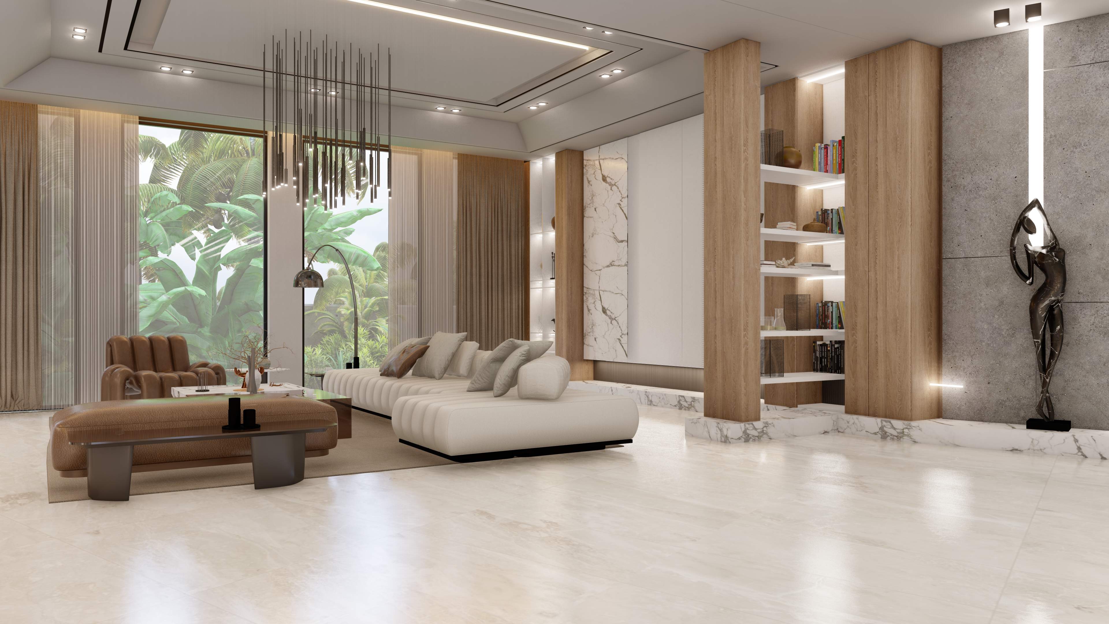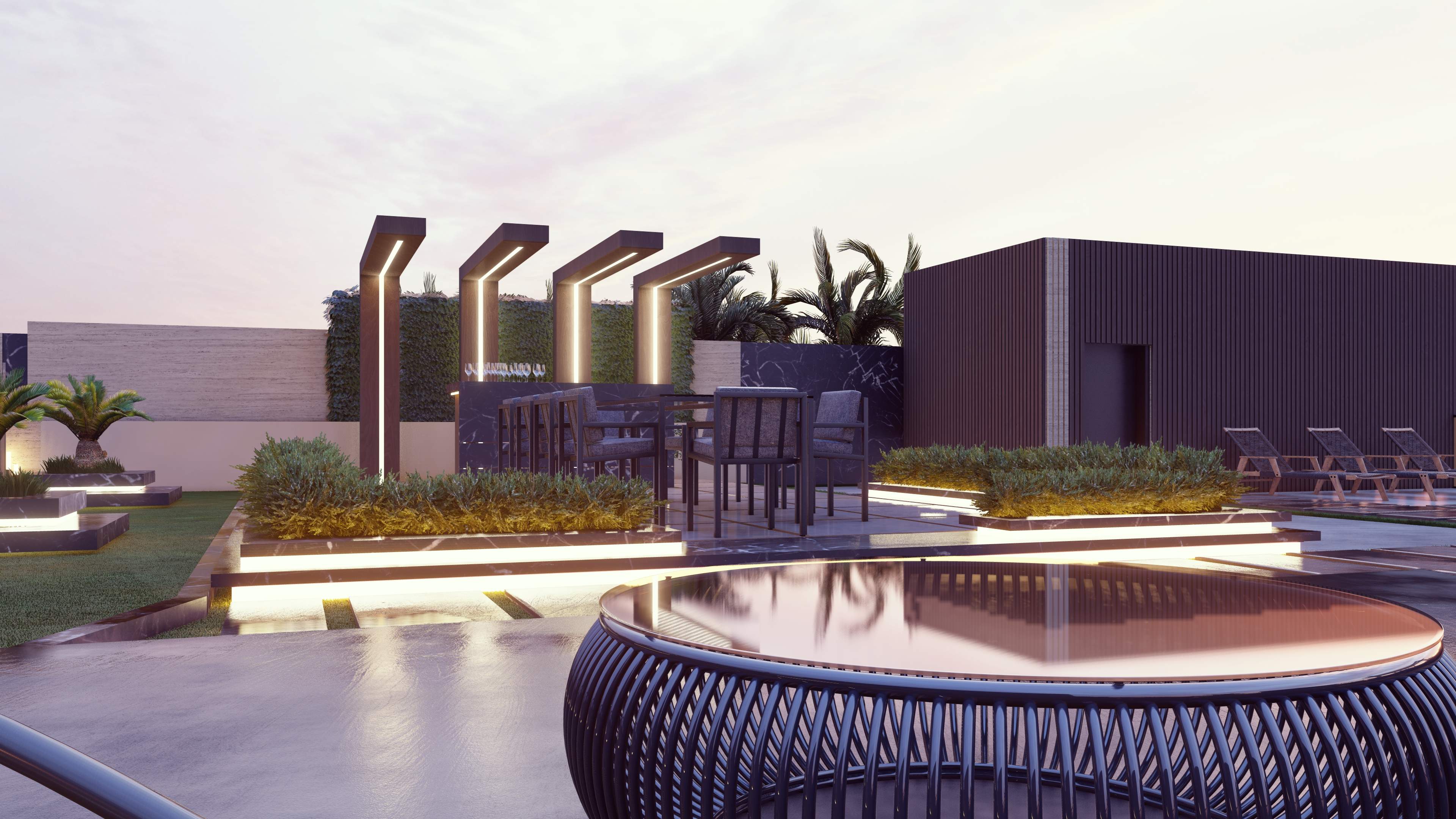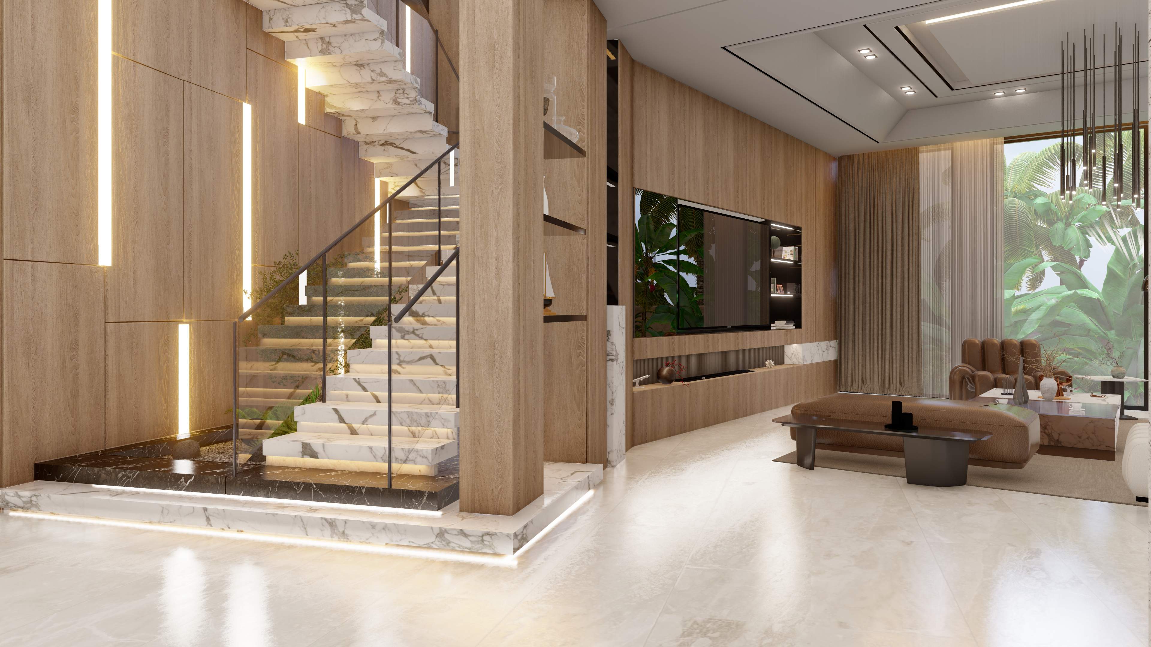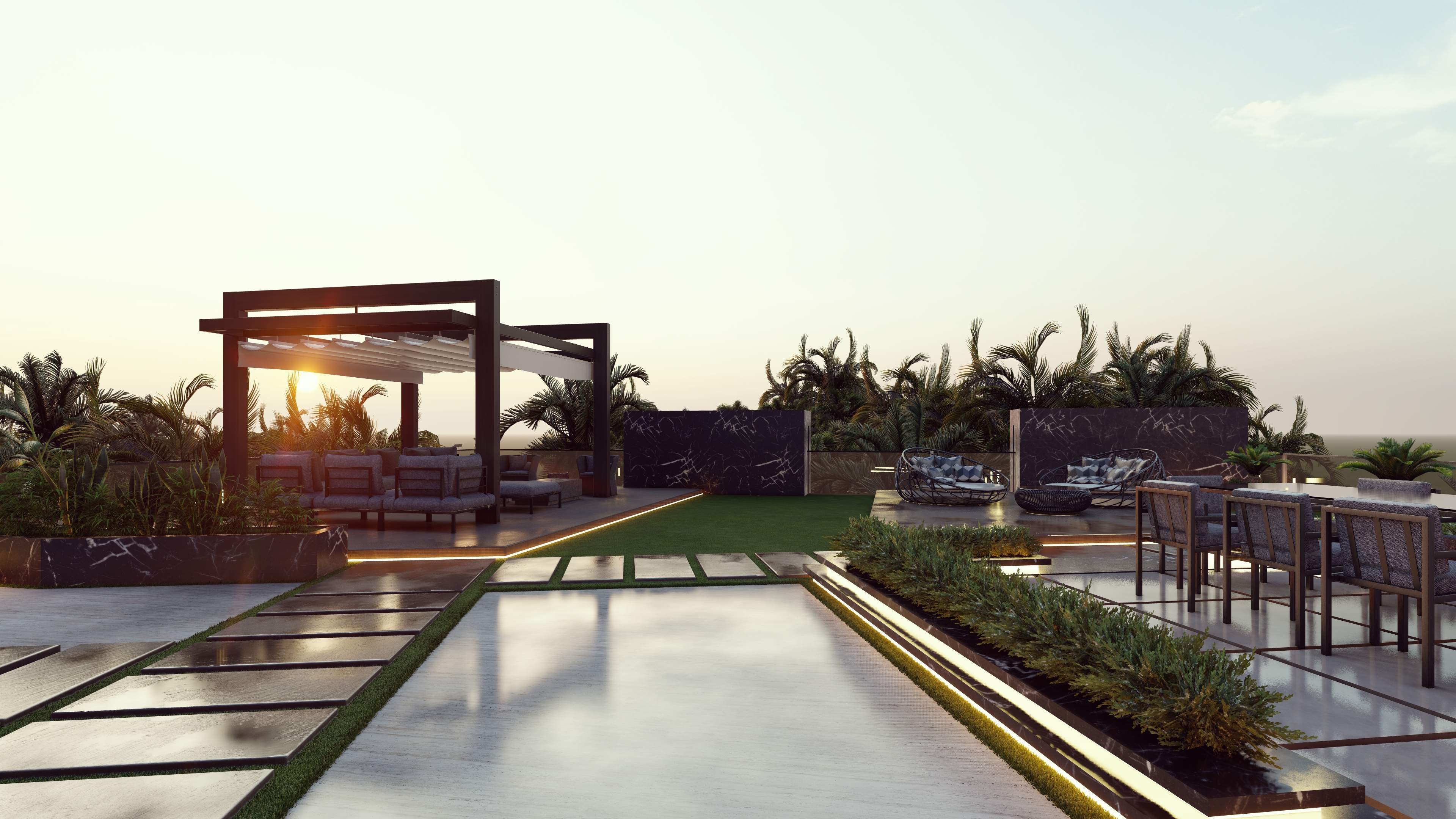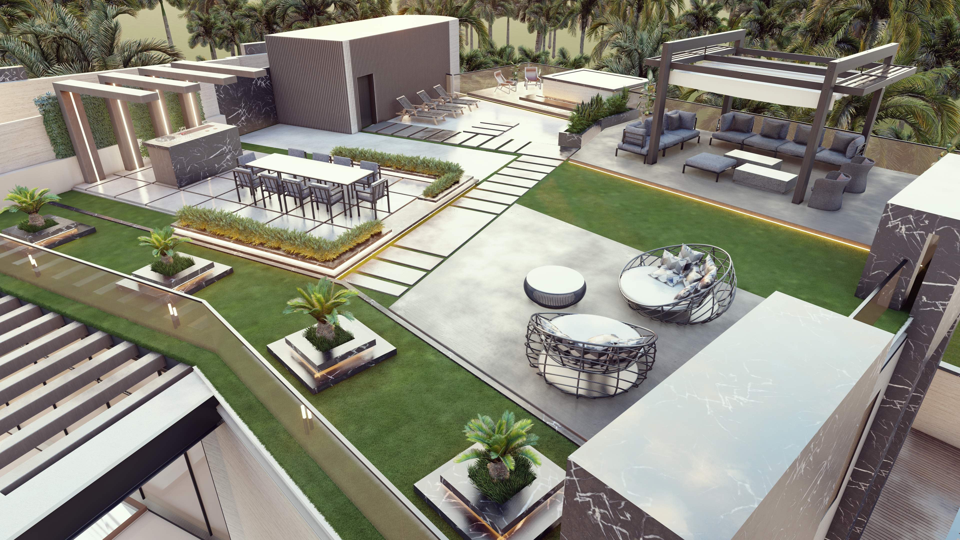 Led the full renovation scope—interior, exterior, and landscaping. The design blends modern architecture with grey tones, Arablar wood, and premium materials like Travertino and Nero Marquina marble, achieving a refined balance of elegance and timeless luxury. A rooftop terrace frames panoramic views of the Burj Al Arab, while the interiors embody calm, sophisticated living.