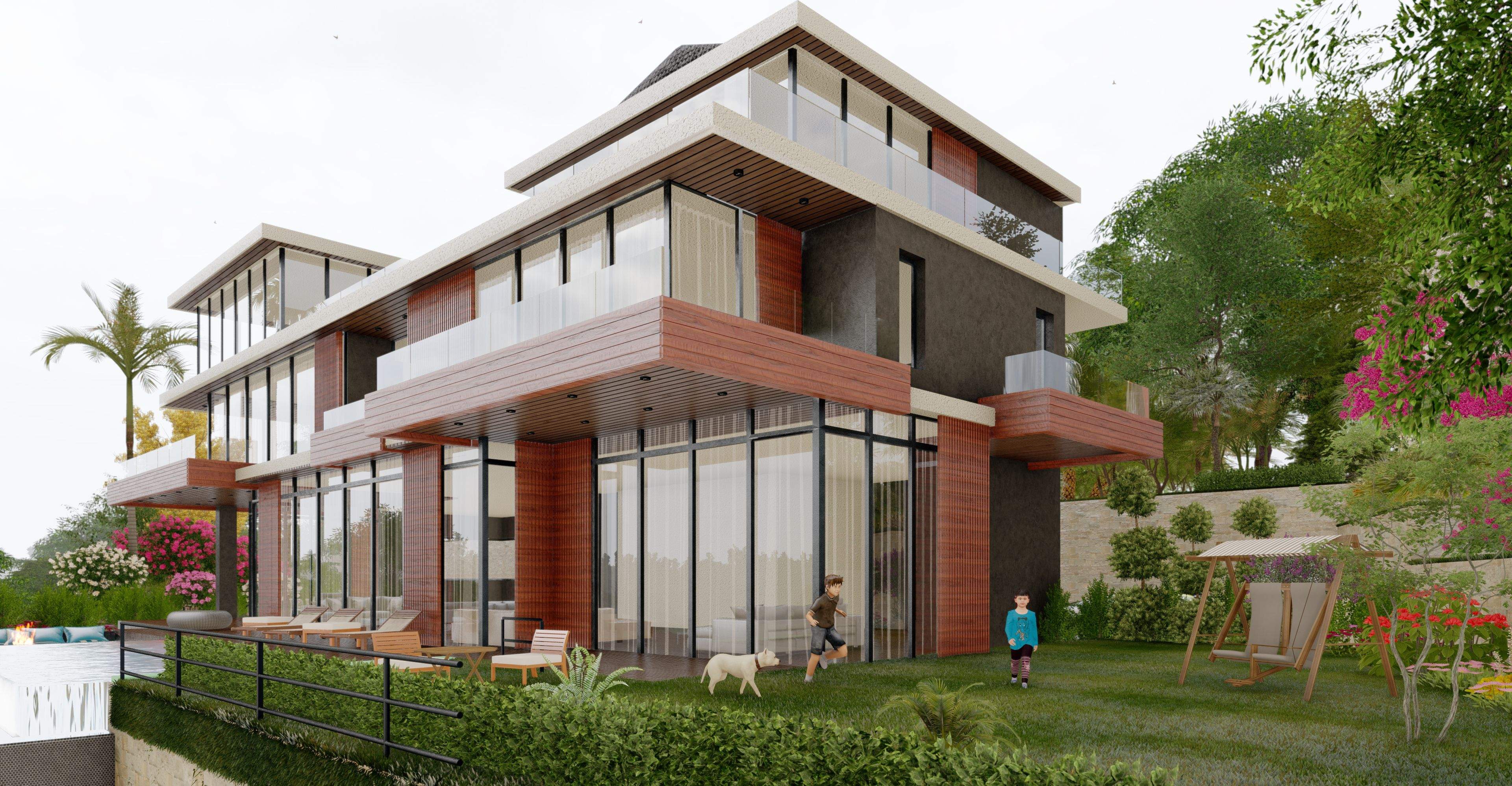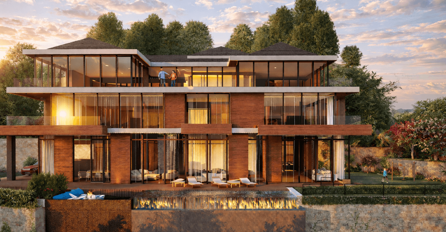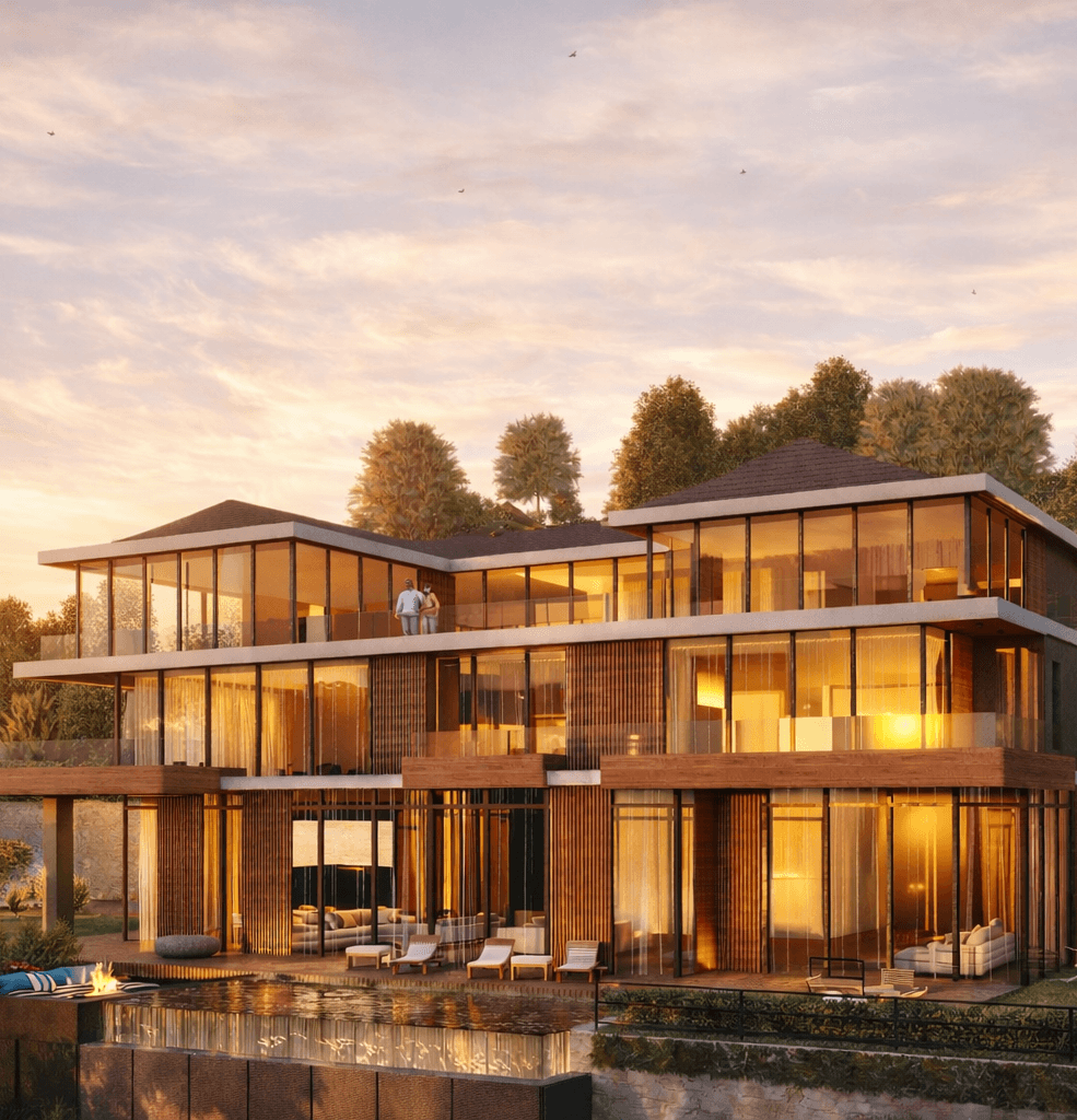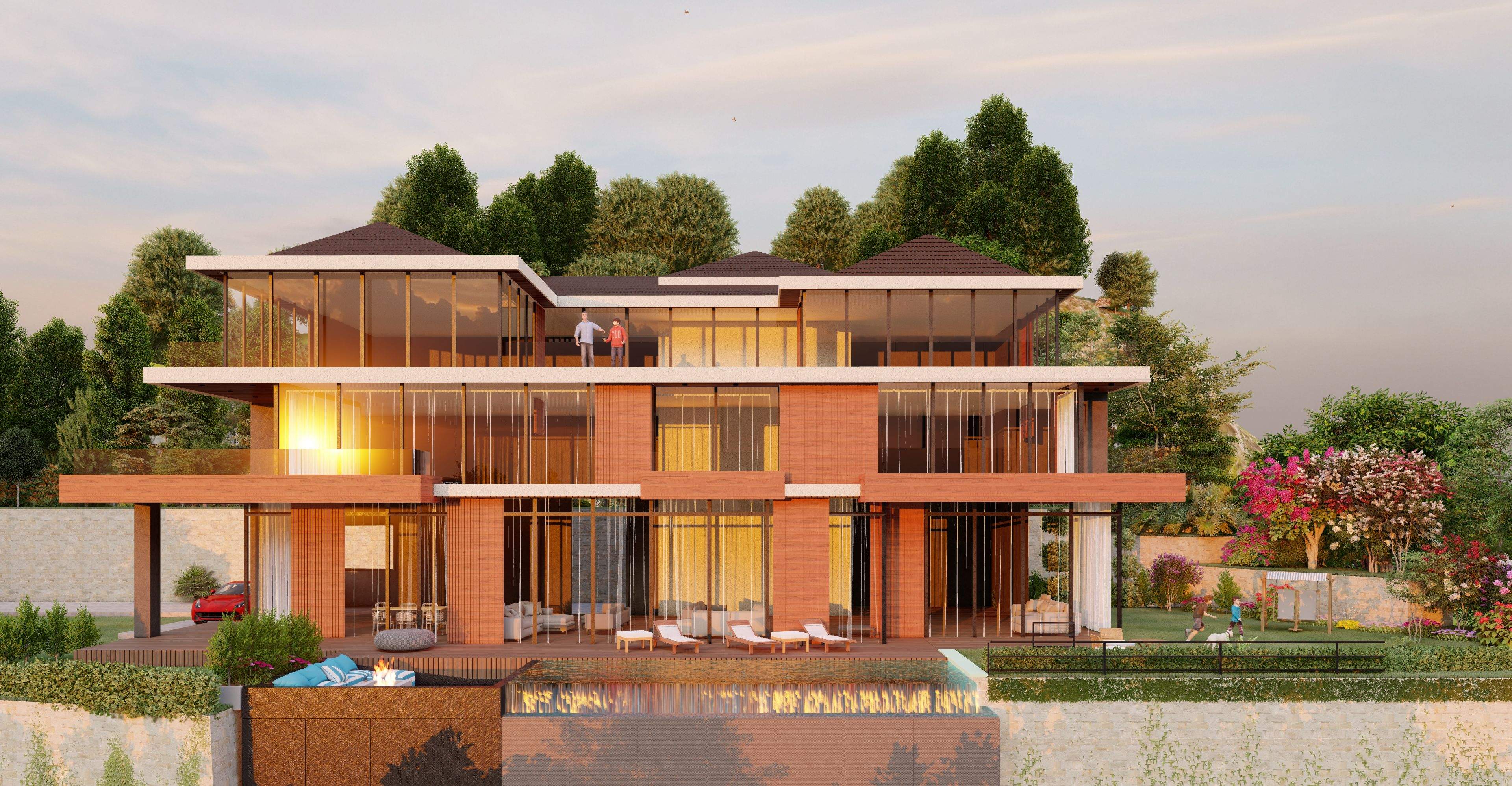 Contemporary villa with clean horizontal lines, flat and sloped roof volumes, extensive floor-to-ceiling glazing, and warm natural cladding. Key features include wide terraces, an infinity-edge pool, open-plan interiors, and seamless integration with landscaped gardens and mountain views.