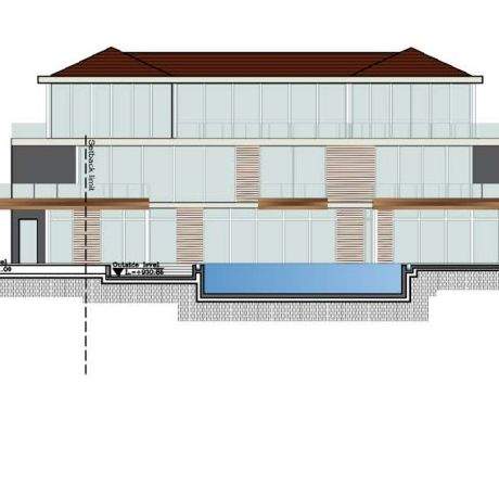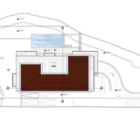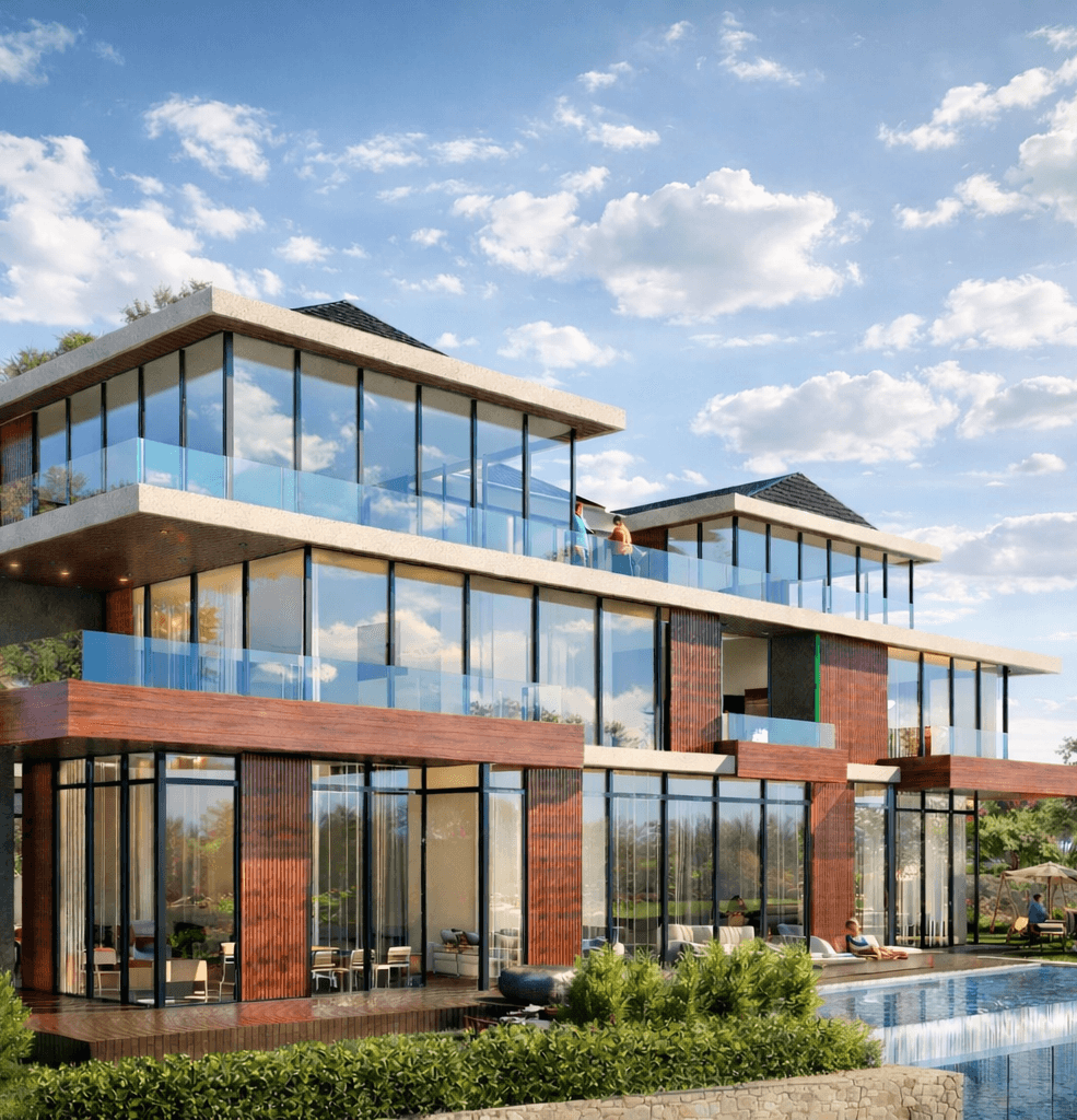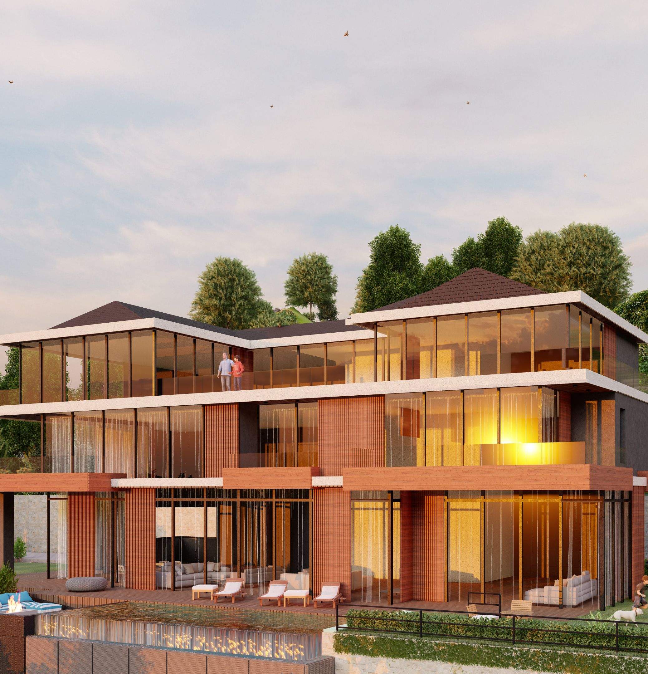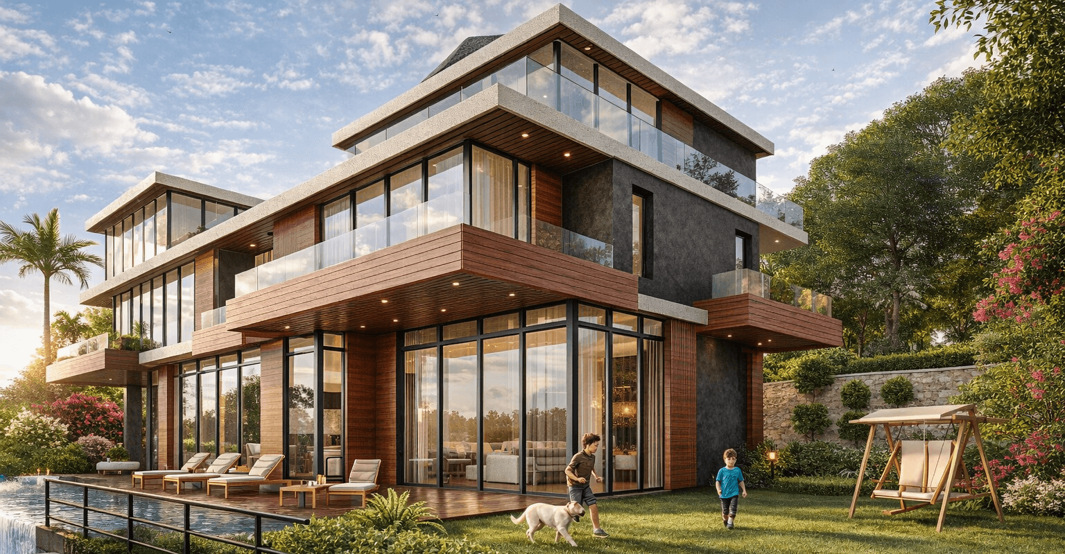 Contemporary villa with clean horizontal lines, flat and sloped roof volumes, extensive floor-to-ceiling glazing, and warm natural cladding. Key features include wide terraces, an infinity-edge pool, open-plan interiors, and seamless integration with landscaped gardens and mountain views.